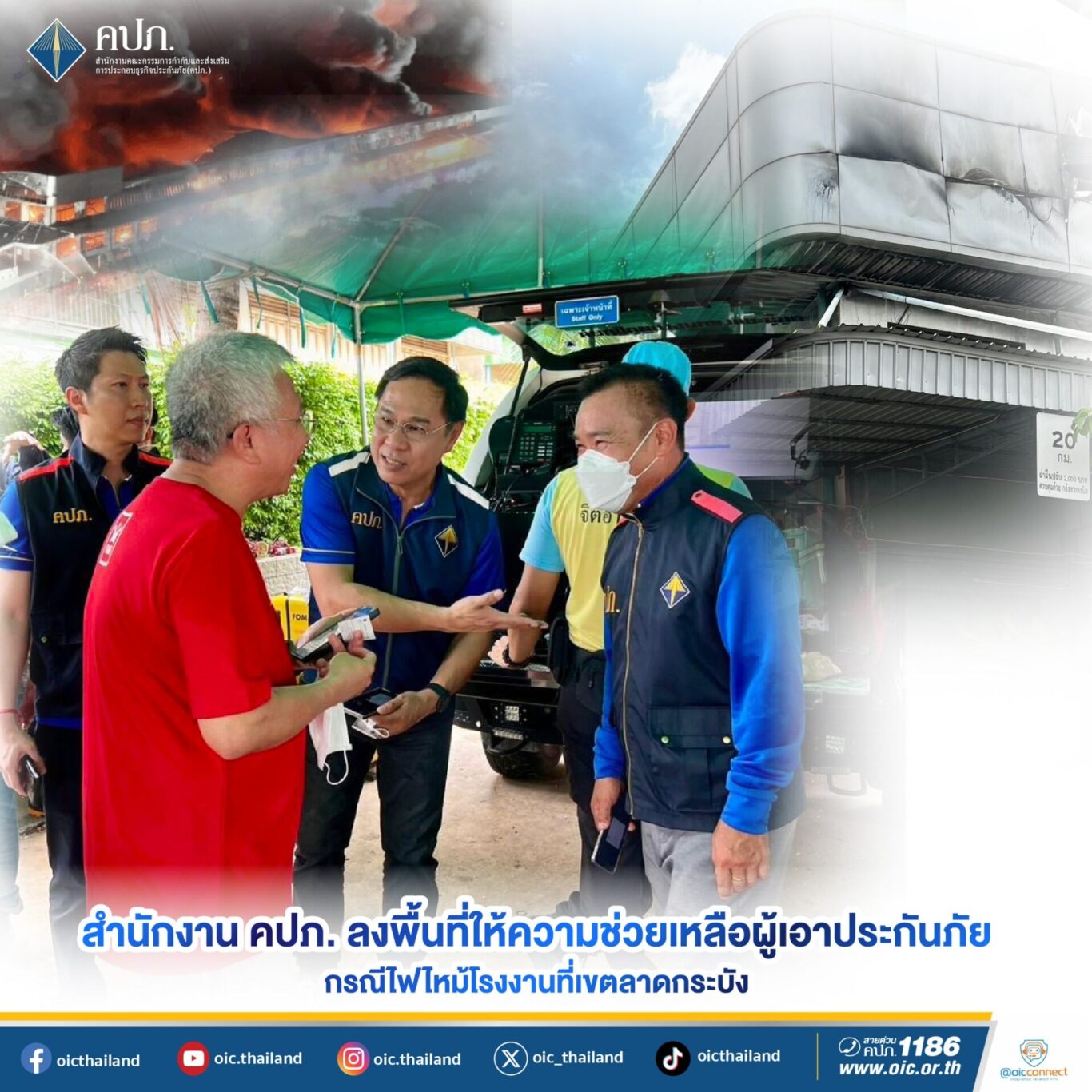 สำนักงานคณะกรรมการกำกับและส่งเสริมการประกอบธุรกิจประกันภัย (สำนักงาน คปภ.) ลงพื้นที่ตรวจสอบพื้นที่โรงงาน/คลังเก็บสินค้าขนาดใหญ่ซึ่งเป็นสถานประกอบการของ บริษัท สยามเฮ้าส์ แอนด์ โฮม จำกัด และ บริษัท ฮั่นโฟนิกซ์ เอ็นเตอร์ไพรส์ จำกัด ซึ่งตั้งอยู่ริมถนนฉลองกรุง ช่วงซอยฉลองกรุง 55 แขวงลำปลาทิว เขตลาดกระบัง กรุงเทพมหานคร ที่เกิดเพลิงไหม้วันที่ 12 พฤษภาคม 2568