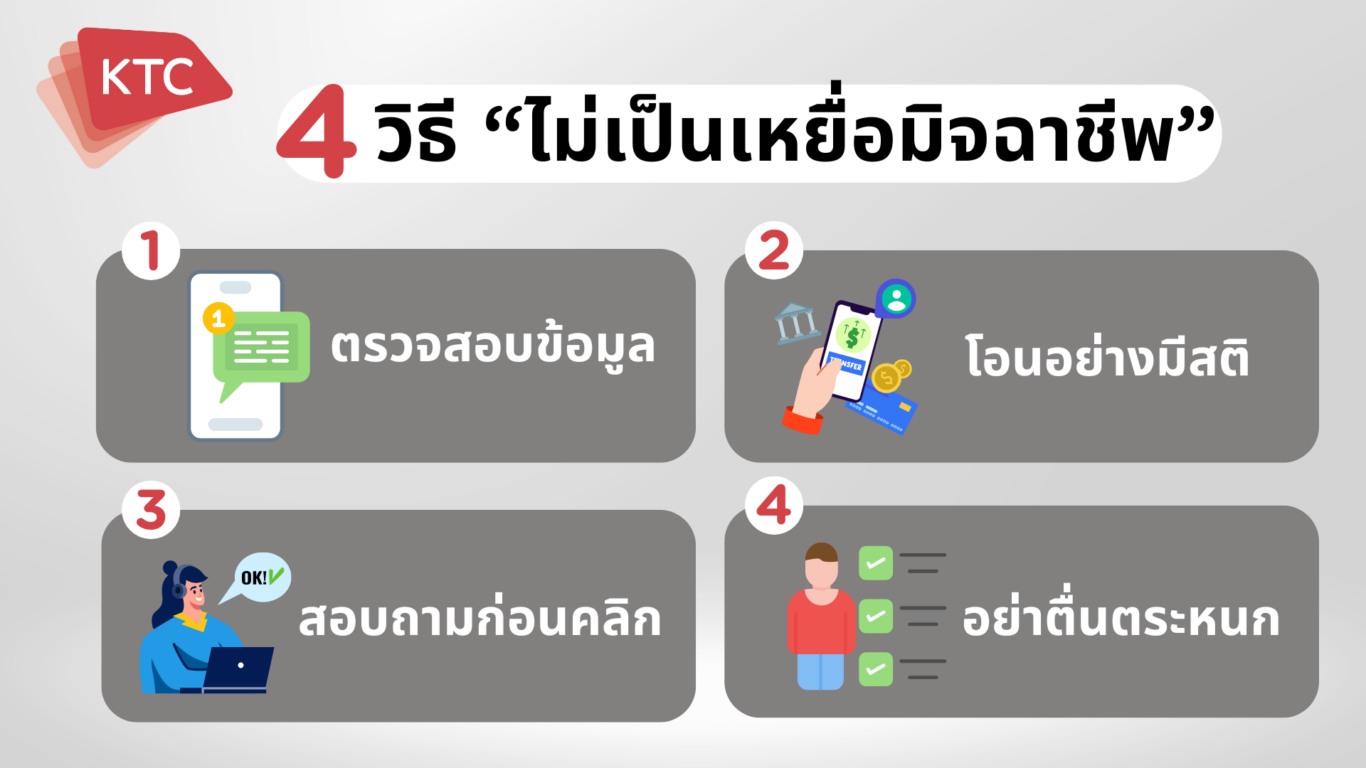4. อย่าตื่นตระหนก อย่าทำอะไรเร็วเกินไปความเร่งรีบและความตกใจเป็นจุดอ่อนที่มิจฉาชีพใช้เป็นเครื่องมือ ดังนั้นต้องตั้งสติ และตรวจสอบก่อนตัดสินใจอย่างสม่ำเสมอ การรู้เท่าทัน และมีสติทุกครั้งในการทำธุรกรรมถือเป็นเกราะชั้นแรกที่จะช่วยให้เรารอดพ้นจากกลโกงของมิจฉาชีพ เพราะปัจจุบันมิจฉาชีพไม่ได้ใช้เทคโนโลยีหลอกลวงเพียงอย่างเดียวเท่านั้น แต่ยังอาศัยความเร่งรีบ และความกลัวของเหยื่อเป็นเครื่องมือในการหลอกลวงด้วย ดังนั้นการมีสติอยู่กับตัวเสมอ คิดให้รอบคอบ และตรวจสอบข้อมูลให้ครบถ้วนก่อนดำเนินการทุกครั้งเป็นสิ่งที่ทุกคนควรทำ