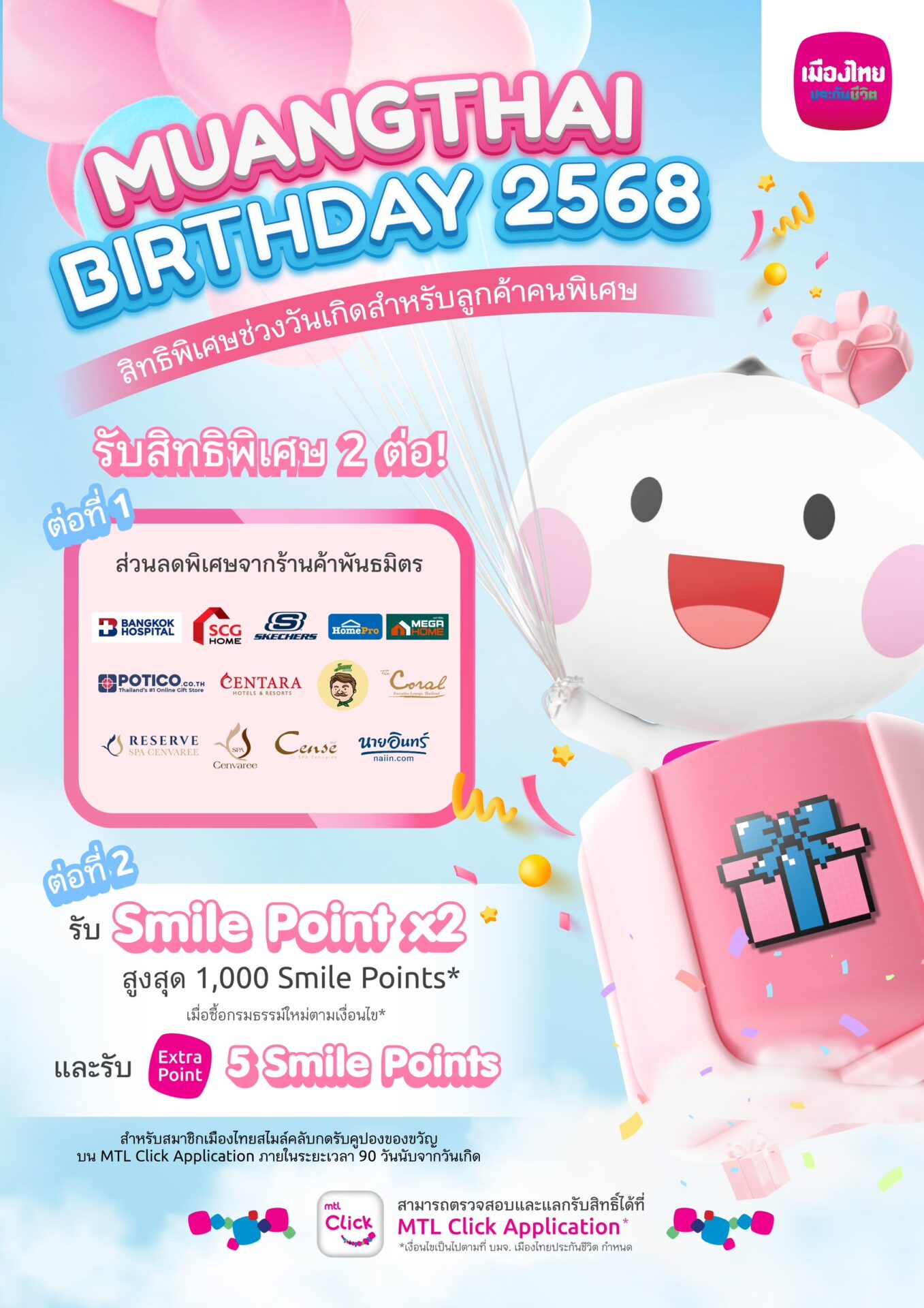 นายสาระ ล่ำซำ ประธานเจ้าหน้าที่บริหาร บริษัท เมืองไทยประกันชีวิต จำกัด (มหาชน) เปิดเผยว่า เมืองไทยประกันชีวิต เดินหน้าส่งมอบความสุขเนื่องในโอกาสวันคล้ายวันเกิดแก่สมาชิกเมืองไทยสไมล์คลับ ประจำปี 2568 รับฟรีคะแนนสะสม 5 Smile Points สำหรับใช้แลกรับสิทธิพิเศษและบริการจากเมืองไทยสไมล์คลับ พร้อมรับคะแนนสะสมเพิ่มพิเศษ 2 เท่า เมื่อซื้อกรมธรรม์ใหม่ตามเงื่อนไข (ยกเว้นประกันชีวิตควบการลงทุน Universal Life, Unit Linked และ PA Stand Alone) และชำระเบี้ยประกันภัยแบบรายปี โดยผู้ที่ต้องการรับสิทธิ์นี้ จะต้องกดรับสิทธิ์ผ่านแอปพลิเคชัน MTL Click ก่อนทำการซื้อกรมธรรม์ใหม่ ภายในระยะเวลา 90 วันนับจากวันเกิด