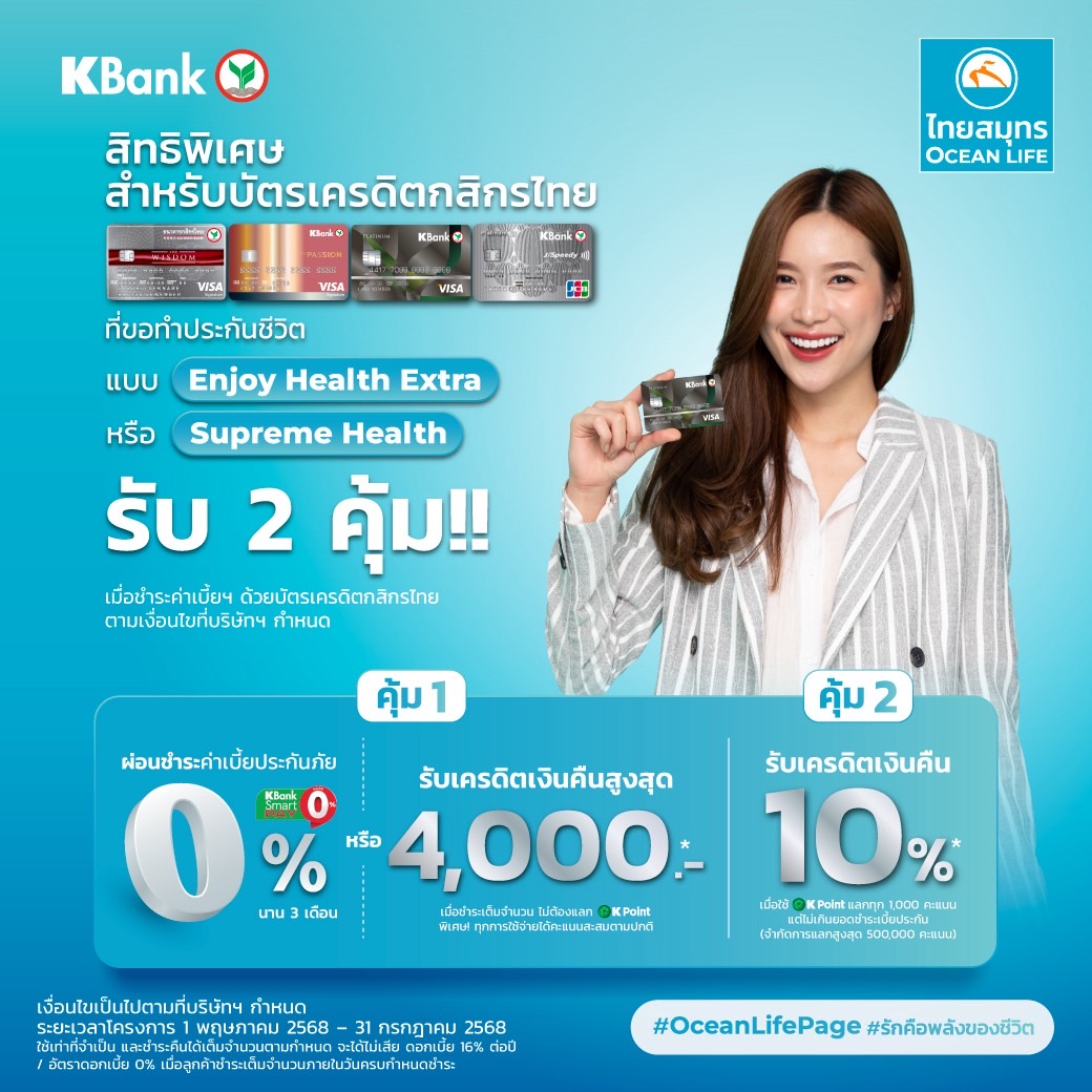 นอกจากนี้ ยังสามารถเลือกใช้คะแนนสะสมจากบัตรเครดิตกสิกรไทยเพื่อแลกรับเครดิตเงินคืน 10% ตามเงื่อนไขที่ธนาคารกำหนด ซึ่งแคมเปญนี้จัดขึ้นระหว่างวันที่ 1 พฤษภาคม – 31 กรกฎาคม 2568 เพื่อตอบโจทย์ไลฟ์สไตล์ของคนรุ่นใหม่ที่ใส่ใจทั้งสุขภาพและการวางแผนทางการเงิน ด้วยความคุ้มค่าและความสะดวกสบายที่มากยิ่งขึ้น