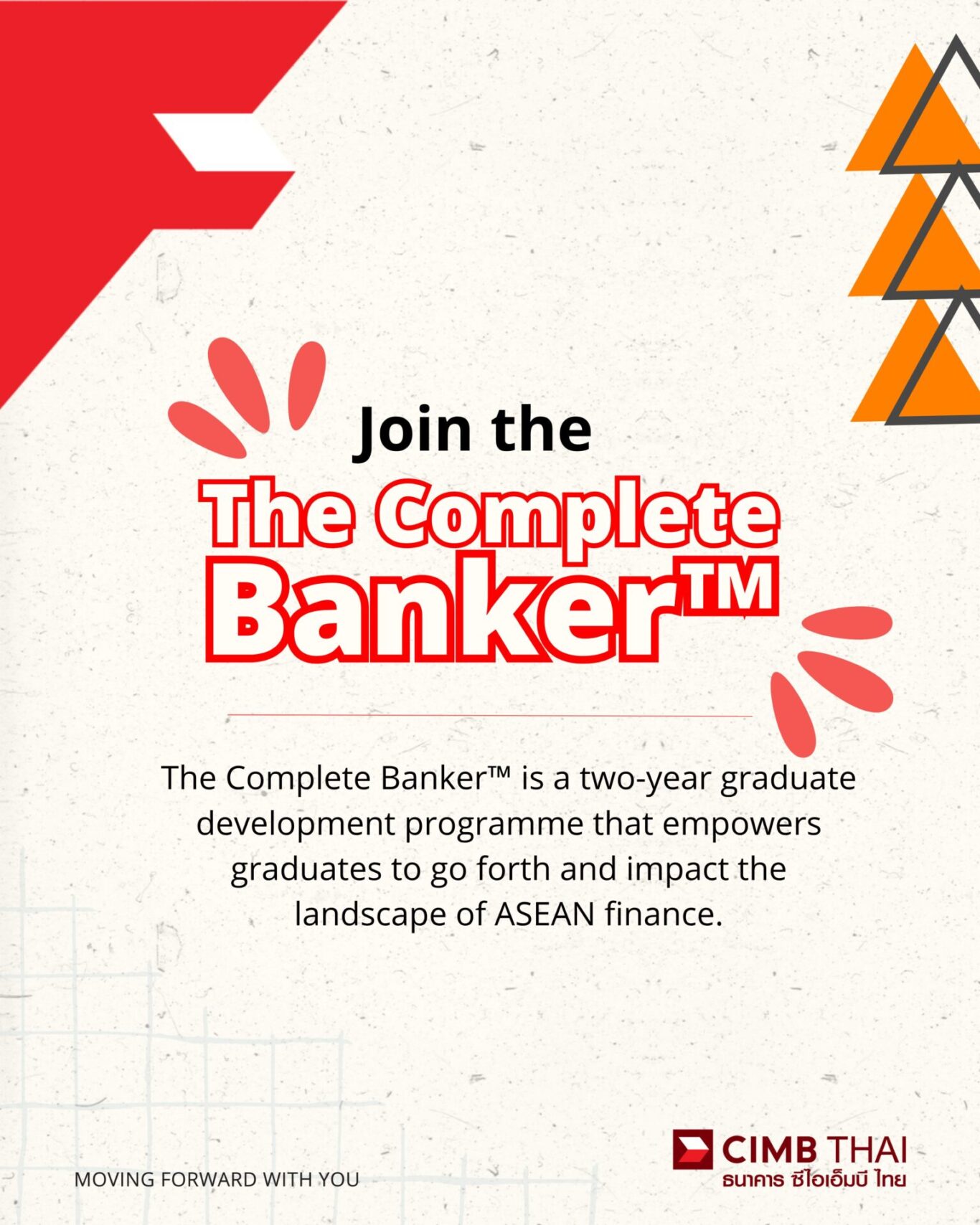 ธนาคาร ซีไอเอ็มบี ไทย จำกัด (มหาชน) เชิญชวนนิสิตและนักศึกษาจบใหม่ที่มีความมุ่งมั่นและมีศักยภาพ เข้าร่วมโครงการ The Complete Banker™ (TCB) ประจำปี 2568 โปรแกรมพัฒนาผู้นำรุ่นใหม่ในสายงานการเงินที่ได้รับการยอมรับในระดับภูมิภาคอาเซียน โดยมุ่งเน้นการเสริมสร้างทักษะ ความรู้ และวิสัยทัศน์ เพื่อเตรียมความพร้อมสู่การเป็นผู้นำในโลกธุรกิจการเงินที่เปลี่ยนแปลงอย่างรวดเร็ว เปิดรับสมัครตั้งแต่วันนี้จนถึงวันที่ 31 พฤษภาคม 2568