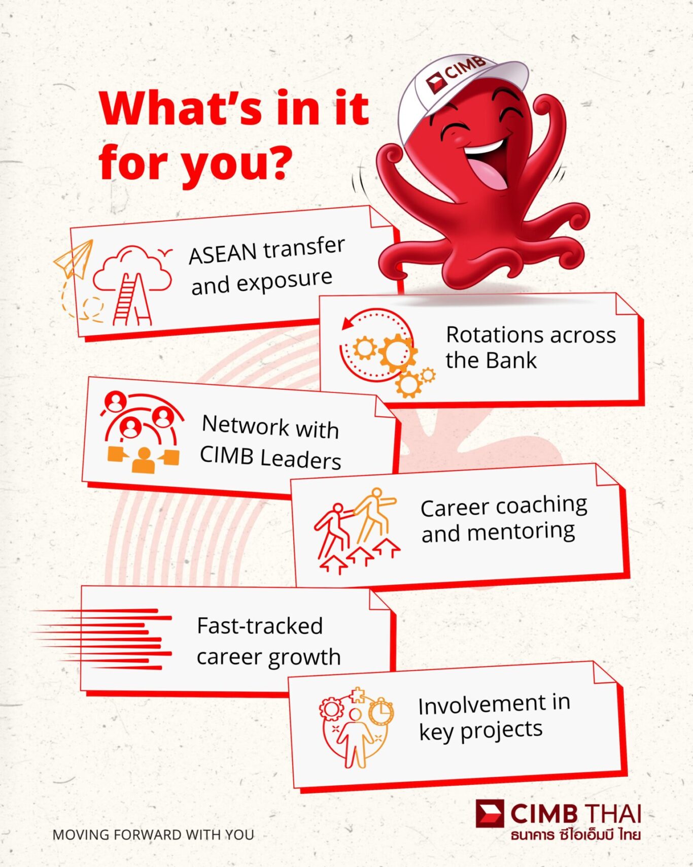 อนึ่ง โครงการนี้นับเป็นอีกหนึ่งโอกาสสำคัญสำหรับนิสิตและนักศึกษาที่ต้องการต่อยอดความรู้จากรั้วมหาวิทยาลัยสู่โลกการทำงานจริง พร้อมก้าวสู่การเป็นผู้นำในสายงานการเงินในอนาคต ร่วมเป็นส่วนหนึ่งของ #teamCIMBThai และร่วมออกแบบอนาคตของคุณไปพร้อมกับการเปลี่ยนแปลงในโลกการเงิน