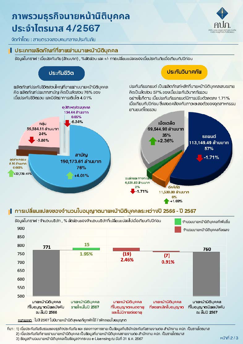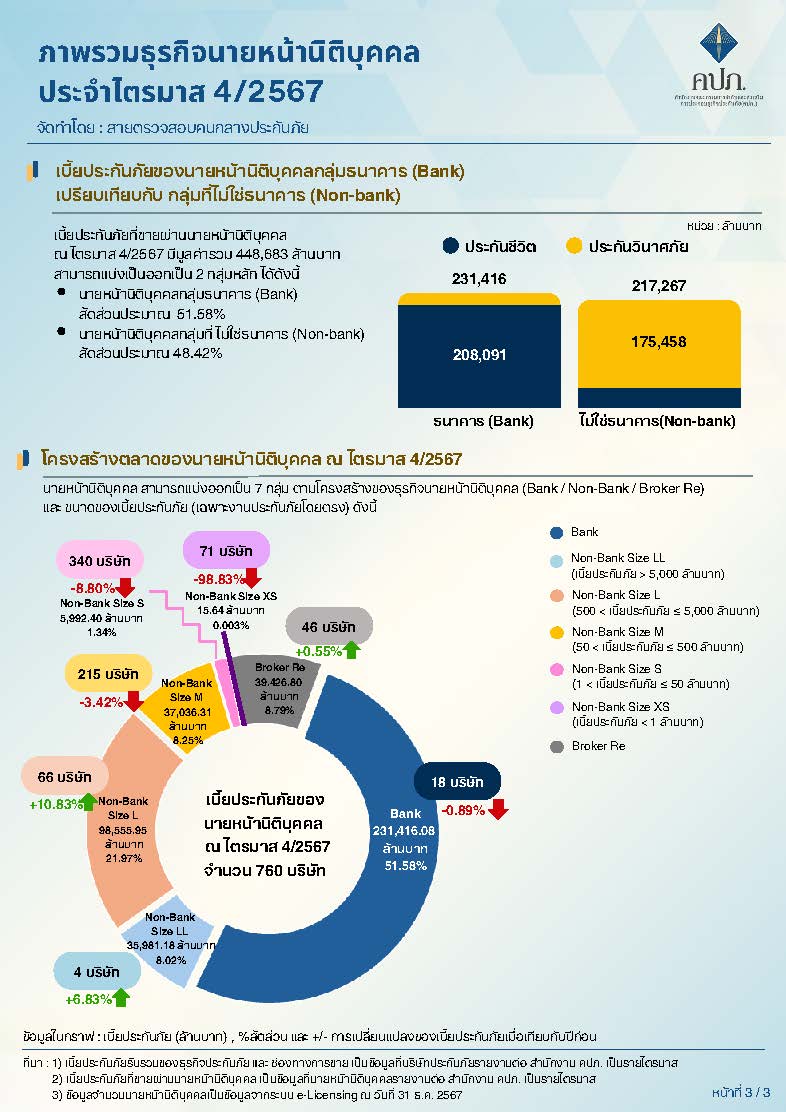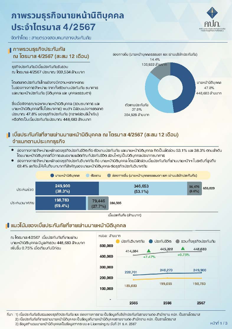 สำนักงานคณะกรรมการกำกับและส่งเสริมการประกอบธุรกิจประกันภัย (สำนักงาน คปภ.) โดยสายตรวจสอบคนกลางประกันภัย เปิดเผยข้อมูลว่า ในปี 2567 เบี้ยประกันภัยที่เสนอขายผ่านนายหน้านิติบุคคลมีมูลค่ารวมกว่า 448,683 ล้านบาท เพิ่มขึ้น ร้อยละ 0.75 จากปีก่อนหน้า คิดเป็นส่วนแบ่งการตลาดประมาณ ร้อยละ 47.8 ของเบี้ยประกันภัยรวม แบ่งเป็นเบี้ยประกันชีวิต 249,900 ล้านบาท และเบี้ยประกันวินาศภัย 198,783 ล้านบาท สะท้อนบทบาทสำคัญของนายหน้านิติบุคคลในฐานะคนกลางประกันภัย ที่ช่วยให้ประชาชนสามารถเข้าถึงผลิตภัณฑ์ประกันภัยได้มากขึ้น โดยผลิตภัณฑ์ประกันชีวิตที่ขายผ่านนายหน้านิติบุคคล ส่วนใหญ่เป็นประกันชีวิตประเภทสามัญ คิดเป็นสัดส่วน ร้อยละ76 ของเบี้ยประกันชีวิตรวม มีอัตราเติบโต ร้อยละ 4.01 เมื่อเทียบกับปีก่อนหน้า เนื่องจากความหลากหลายของผลิตภัณฑ์ที่สามารถตอบสนองต่อความต้องการของลูกค้า ประกอบกับศักยภาพด้านการตลาดและการเข้าถึงลูกค้าของนายหน้านิติบุคคล ขณะที่ประกันชีวิตกลุ่ม มีสัดส่วนประมาณ ร้อยละ 24 และมีแนวโน้มปรับตัวลดลง ร้อยละ5.86 อันเป็นผลจากภาวะชะลอตัวทางเศรษฐกิจ