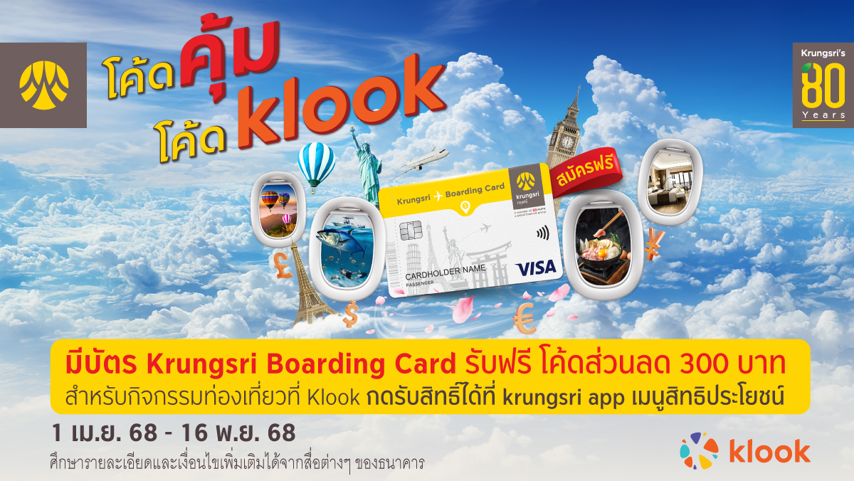 (28 พฤษภาคม 2568) – กรุงศรี (ธนาคารกรุงศรีอยุธยา จำกัด (มหาชน)) มอบสิทธิพิเศษสำหรับลูกค้าผู้ถือบัตร Krungsri Boarding Card ทั้งลูกค้าปัจจุบัน และลูกค้าใหม่ที่สมัครบัตรสำเร็จ พร้อมยืนยันเปิดใช้บัตร รับโค้ดส่วนลดมูลค่า 300 บาท สำหรับกิจกรรมท่องเที่ยวที่ Klook โดยสามารถกดรับสิทธิ์ผ่าน krungsri app เมนูสิทธิประโยชน์ ภายในระยะเวลาตามเงื่อนไขที่กำหนด จนถึงวันที่ 31 ธันวาคม 2568
