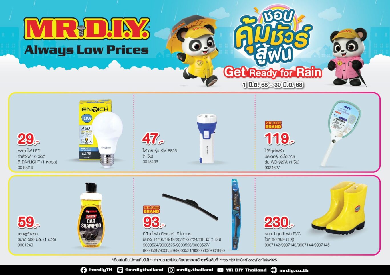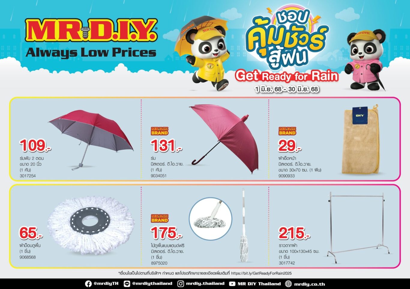 ศึกษารายละเอียดเพิ่มเติมที่ https://bit.ly/GetReadyForRain2025 เงื่อนไขเป็นไปตามที่ธนาคารฯ และบริษัทบัตรฯ กำหนดติดตามข่าวสาร และโปรโมชันอื่น ๆ ของ มิสเตอร์. ดี.ไอ.วาย. ได้ที่ – Facebook: @mrdiyTH, Instagram: @mrdiy.thailand, TikTok: @mrdiy.thailand, Line: @mrdiythailand, LinkedIn: MR.DIY Thailand, และ YouTube: MR DIY Thailand