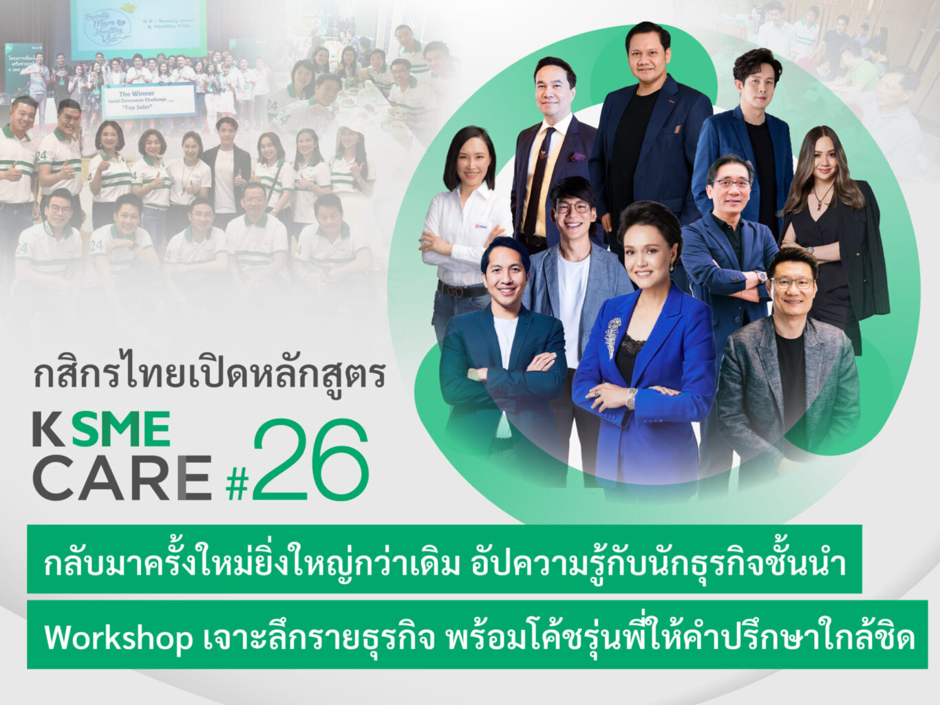 ธนาคารกสิกรไทยเปิดรับสมัครหลักสูตร K SME CARE รุ่น 26 เป็นการกลับมาครั้งใหม่ที่ยิ่งใหญ่กว่าเดิม เพื่อเสริมแกร่งธุรกิจ SME ให้เติบโต ภายใต้แนวคิด “WE GROOM, YOU GROW” K SME ใส่ใจให้ธุรกิจ…ไปได้อีก จัดเต็มทั้งการเปิดมุมมองกับ 10 นักธุรกิจชั้นนำระดับประเทศ เวิร์คช็อปเจาะลึกรายอุตสาหกรรม มีโค้ชรุ่นพี่ให้คำปรึกษา และต่อยอดเครือข่ายธุรกิจ โดย K SME CARE เป็นหลักสูตรที่ให้ทั้งความรู้และเครือข่ายธุรกิจ จัดมาแล้ว 25 รุ่น มีผู้เข้าร่วมอบรมกว่า 14,000 คน