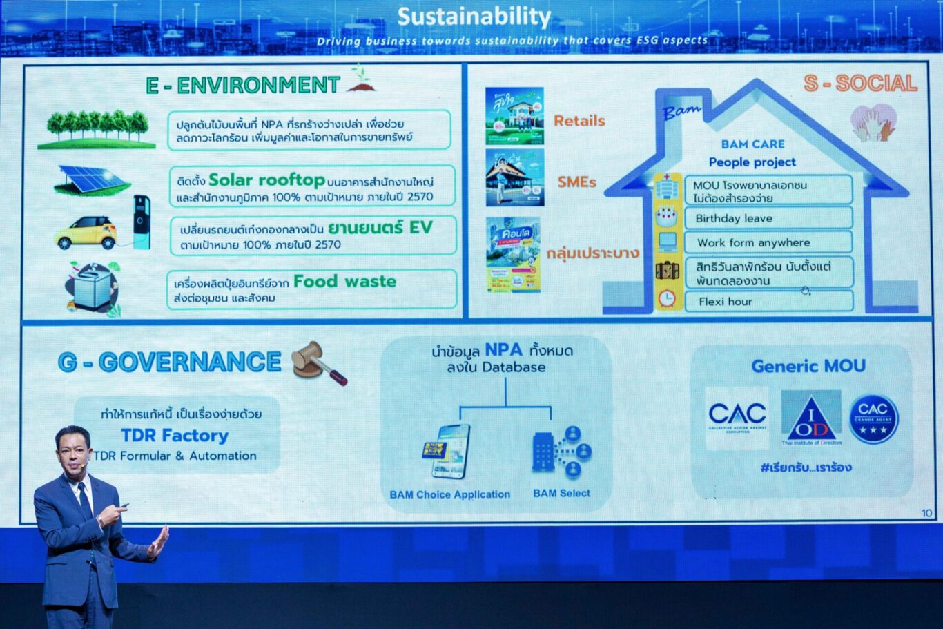 BAM ชูนโยบาย แก้มลิงแห่งชาติ พร้อมขับเคลื่อนองค์กรสู่ความยั่งยืนด้วย ESG ย้ำ BAM ทำ CSR in process ตั้งแต่วันแรกของการดำเนินธุรกิจ โดยการปรับโครงสร้างหนี้ด้วยความประนีประนอมและหาข้อยุติร่วมกัน เผยโครงการสุขใจได้บ้านคืน BAM ช่วยลูกหนี้ประนอมหนี้ได้มากถึง 5,963 ราย ขณะที่โครงการคอนโดราคามหาชน สามารถจำหน่ายทรัพย์ให้กับผู้มีรายได้น้อยได้มีที่อยู่อาศัยมากถึง 3,331 รายการ