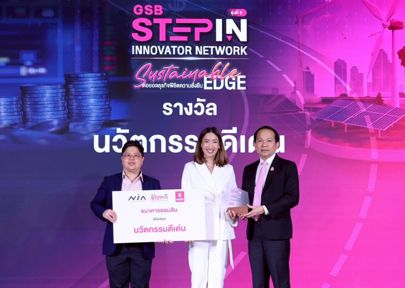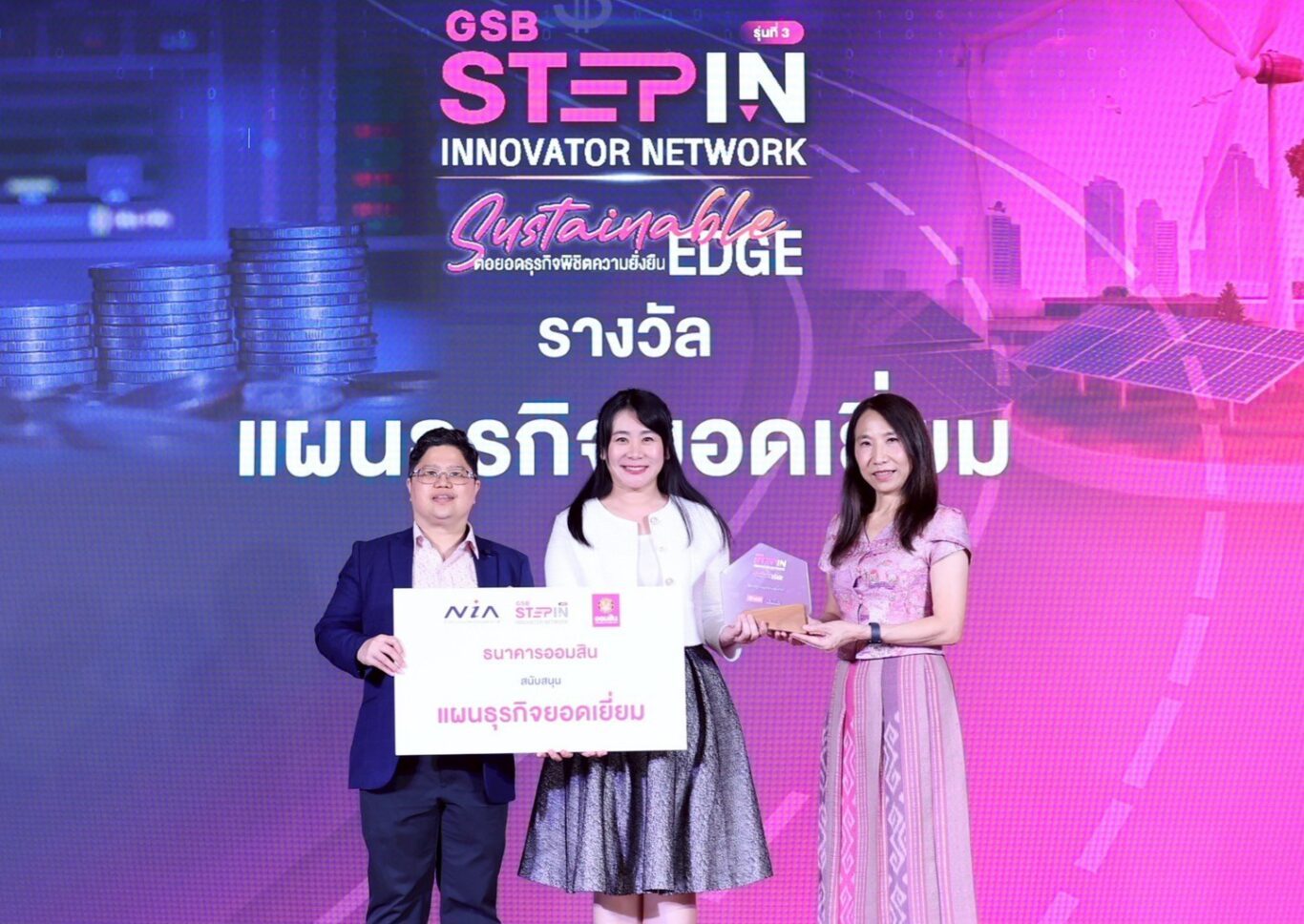 นายเสกสรร ทวีกสิกรรม และ นางรักษยา ศิริบริรักษ์ รองผู้อำนวยการธนาคารออมสิน พร้อมด้วย นายศักดิ์สิทธิ์ สุนทรกุล ผู้ช่วยผู้อำนวยการธนาคารออมสิน สายงานพัฒนาธุรกิจผู้ประกอบการรายย่อย และ SMEs Start up และ ดร.กริชผกา บุญเฟื่อง ผู้อำนวยการสำนักงานนวัตกรรมแห่งชาติ (องค์การมหาชน) ร่วมมอบโล่เกียรติคุณและประกาศนียบัตร ในโครงการ GSB Step In Innovator Network สร้างผู้ประกอบการด้วยฐานนวัตกรรม ปี 3 ภายใต้คอนเซ็ปต์ Sustainable Edge ต่อยอดธุรกิจ พิชิตความยั่งยืน ด้วย BCG Model & ESG Strategy เปลี่ยนธุรกิจให้เติบโตด้วยนวัตกรรมและความยั่งยืน