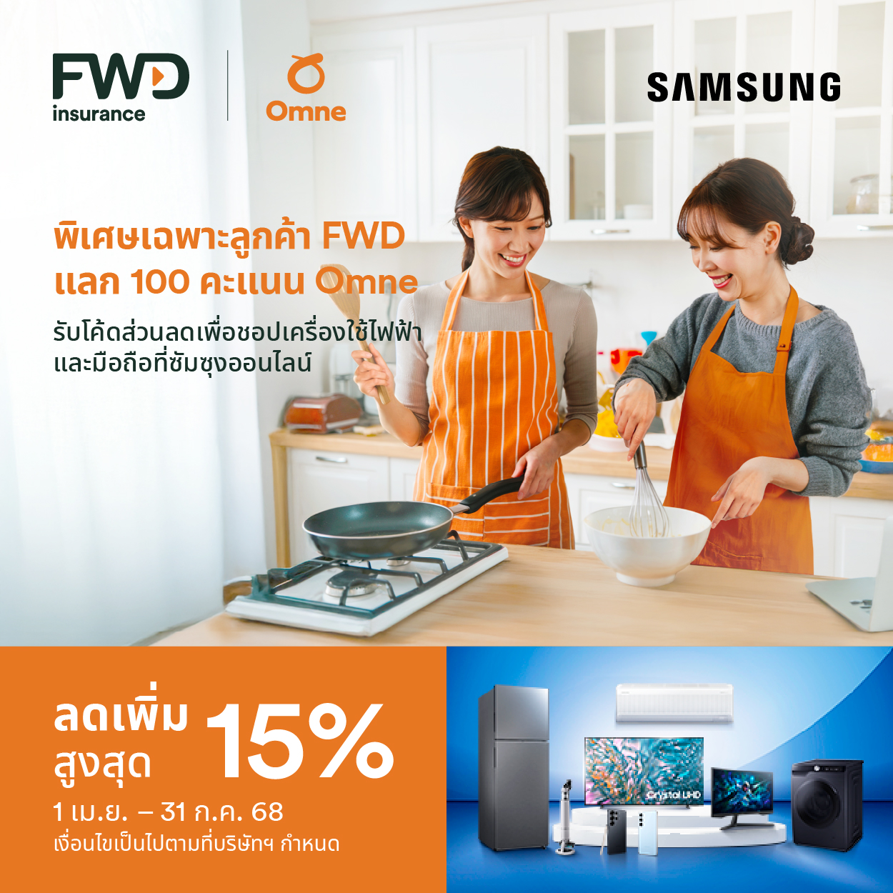 FWD ประกันชีวิต เสิร์ฟดีลเด็ดเอาใจลูกค้าคนพิเศษสายเทคโนโลยีและไลฟ์สไตล์ยุคใหม่โดยเฉพาะ เพียงแลกคะแนน Omne 100 คะแนน รับโค้ดส่วนลดสูงสุด 15% ไปใช้กับเครื่องใช้ไฟฟ้าและสมาร์ทโฟน Samsung ที่ร่วมรายการได้เลย ไม่ว่าจะเป็นสมาร์ททีวี ตู้เย็น หรือมือถือรุ่นใหม่ ช้อปง่ายผ่านเว็บไซต์ https://www.samsung.com/th/ หรือแอป Samsung Shop ตั้งแต่วันนี้ถึง 31 กรกฎาคม 2568 หรือจนกว่าสิทธิ์จะเต็ม โค้ดใช้ได้ 1 ครั้งต่อคำสั่งซื้อ ไม่ต้องมียอดขั้นต่ำอยากได้ส่วนลดสุดคุ้มแบบนี้ เพียงแค่เป็นลูกค้า FWD ประกันชีวิต แล้วใช้แอป Omne by FWD ให้เป็นประโยชน์ ง่ายและคุ้มกว่านี้ไม่มีอีกแล้ว ใครยังไม่มีแอป Omne by FWD ดาวน์โหลดฟรีตอนนี้เลย บน App Store และ Google Play Store แอปที่ให้คุณสะสมคะแนนจากกิจกรรมดีๆ แล้วนำมาแลกสิทธิพิเศษด้านสุขภาพและไลฟ์สไตล์ได้อีกเพียบ แลกคะแนน แล้วไปช้อปกัน!