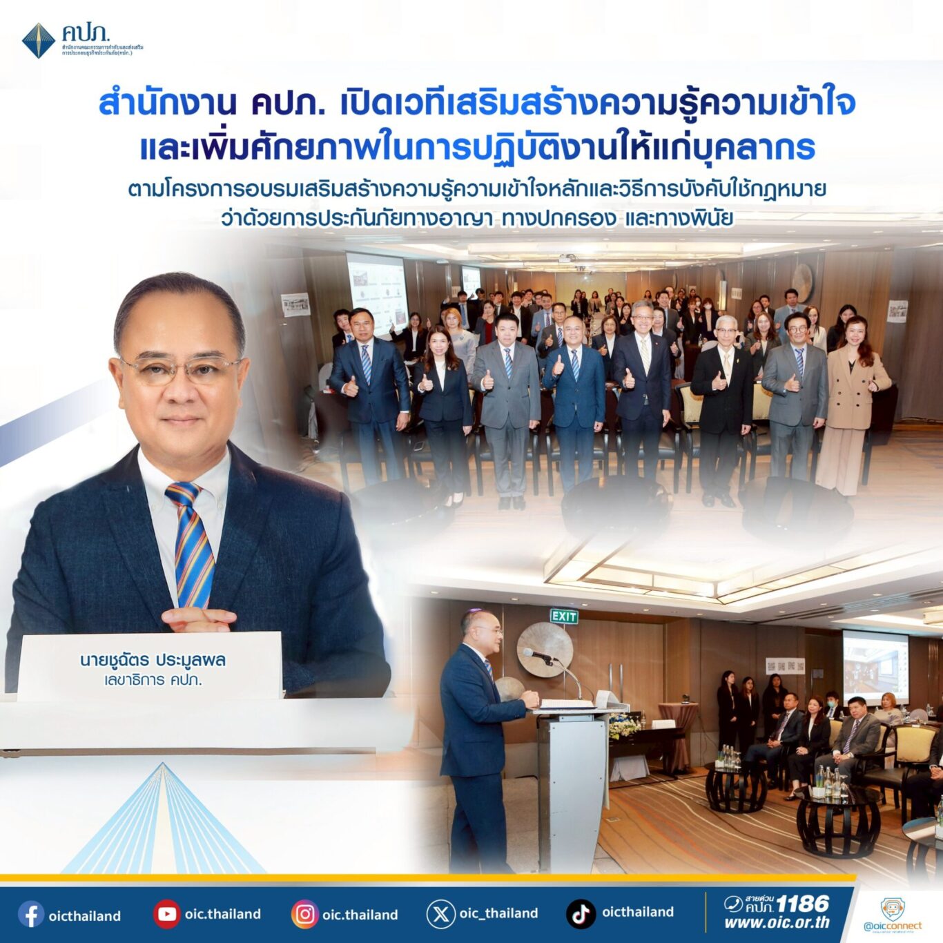 เมื่อวันที่ 15 พฤษภาคม 2568 นายชูฉัตร ประมูลผล เลขาธิการคณะกรรมการกำกับและส่งเสริมการประกอบธุรกิจประกันภัย (เลขาธิการ คปภ.) เป็นประธานเปิดโครงการอบรมเสริมสร้างความรู้ความเข้าใจหลักและวิธีการบังคับใช้กฎหมาย ว่าด้วยการประกันภัย ทางอาญา ทางปกครอง และทางพินัย ณ โรงแรมเซ็นทารา แกรนด์ เซ็นทรัลพลาซา ลาดพร้าว ระหว่างวันที่ 15 พฤษภาคม 2568 ถึงวันที่ 5 มิถุนายน 2568 โดยมีวัตถุประสงค์ในการเสริมสร้างความรู้ความเข้าใจและเพิ่มศักยภาพในการปฏิบัติงานให้แก่บุคลากรของสำนักงาน ทั้งส่วนกลาง และภูมิภาค ในหัวข้อกฎหมายที่น่าสนใจและมีมิติที่หลากหลายครอบคลุมการปฏิบัติงานของสำนักงาน คปภ. ได้แก่ หลักกฎหมายแพ่งและพาณิชย์ว่าด้วยประกันภัย การดำเนินคดีทั้งทางแพ่งและทางอาญา การออกคำสั่งและใช้มาตรการบังคับทางปกครอง การจัดซื้อจัดจ้างและสัญญาทางปกครอง กระบวนการปรับเป็นพินัย ตลอดจนกฎหมายเกี่ยวกับความรับผิดทางละเมิดของเจ้าหน้าที่
