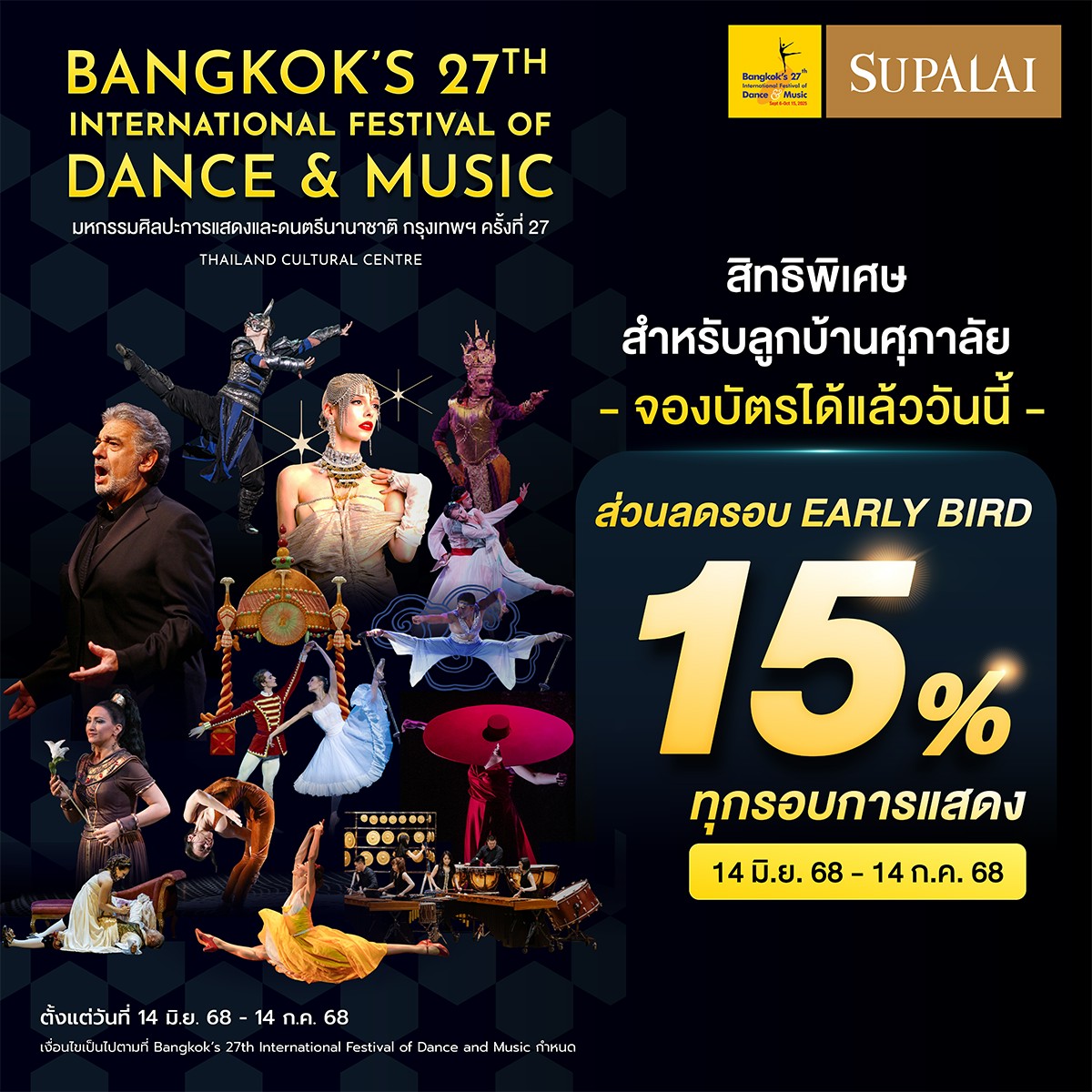ศุภาลัย ยังมอบสิทธิพิเศษให้ลูกบ้านคนสำคัญ รับส่วนลดสูงสุด 15%* ในทุกเรื่อง ทุกรอบการแสดง ของ “งานมหกรรมศิลปะการแสดงและดนตรีนานาชาติ กรุงเทพฯ ครั้งที่ 27 (Bangkok’s 27th International Festival of Dance and Music 2025)” เมื่อซื้อบัตรรอบ Early Bird ตั้งแต่วันที่ 14 มิ.ย. 68 – 14 ก.ค. 68 นี้ (หรือจนกว่าสิทธิ์จะหมด) คลิกเพื่อรับสิทธิ์ได้ที่ แอปพลิเคชัน Supalai SABAI