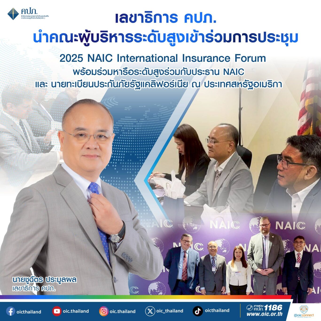 นายชูฉัตร ประมูลผล เลขาธิการสำนักงานคณะกรรมการ กำกับและส่งเสริมการประกอบธุรกิจประกันภัย (เลขาธิการ คปภ.) พร้อมด้วย นายอาภากร ปานเลิศ รองเลขาธิการด้าน กำกับธุรกิจประกันภัย นางมยุรินทร์ สุทธิรัตนพันธ์ ผู้ทรงคุณวุฒิพิเศษ และคณะผู้บริหารระดับสูง เดินทางเข้าร่วม การประชุม “2025 NAIC International Insurance Forum” ระหว่างวันที่ 29-30 พฤษภาคม 2568 ณ กรุง วอชิงตัน ดี.ซี. สหรัฐอเมริกา ภายใต้แนวคิด “Stronger, Smarter, and More Resilient Together” โดย สมาคมนายทะเบียนประกันภัยประเทศสหรัฐอเมริกา (NAIC) เป็นเจ้าภาพจัดขึ้นอย่างต่อเนื่องทุกปี เพื่อเป็นเวทีสำคัญที่เปิดโอกาสให้หน่วยงานกำกับดูแลธุรกิจประกันภัย และบริษัทประกันภัยจากทั่วโลกได้แลกเปลี่ยนองค์ความรู้ และประสบการณ์