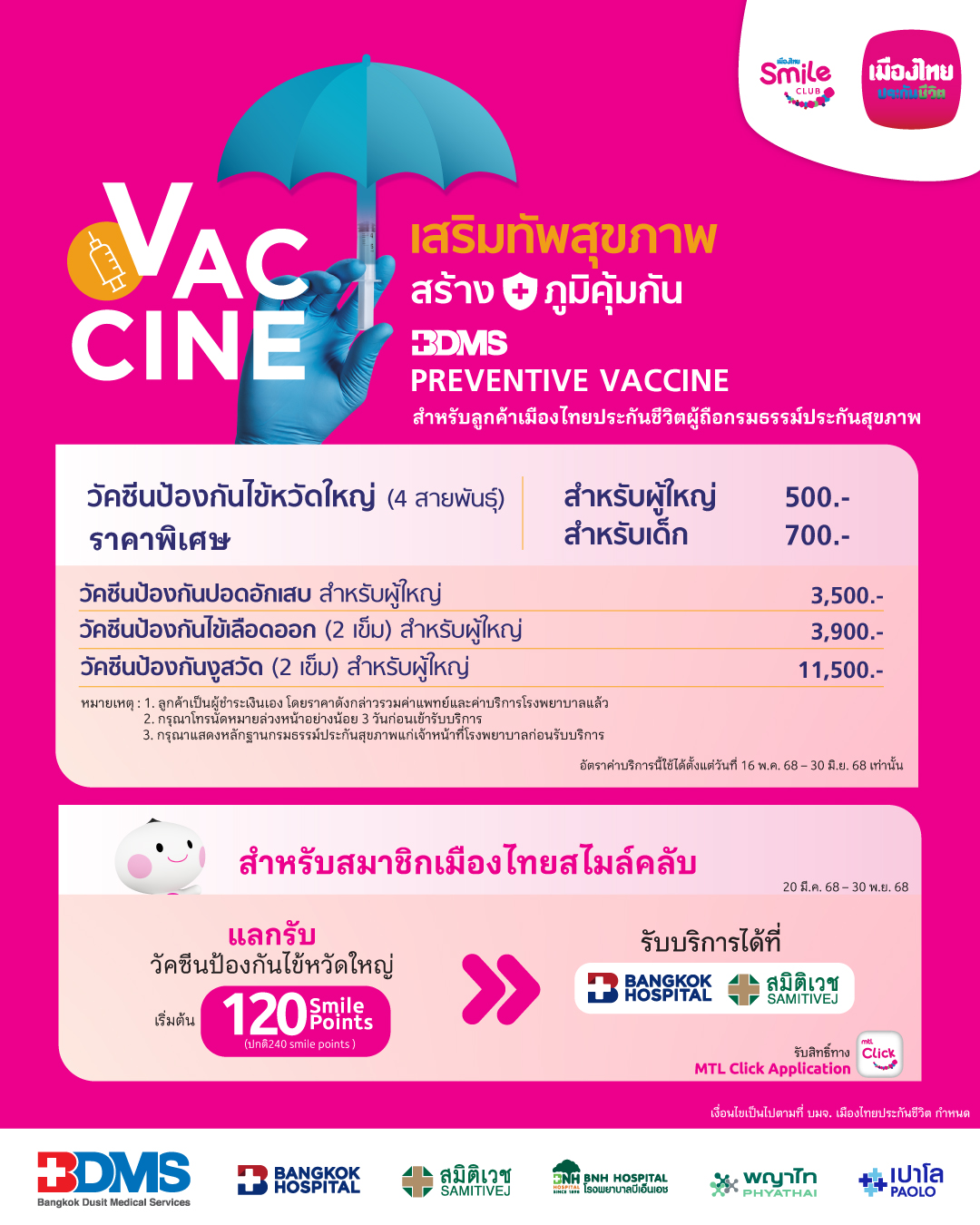 นอกจากนี้ เมืองไทยประกันชีวิตยังได้ร่วมแคมเปญ “BDMS PREVENTIVE VACCINE” มอบสิทธิพิเศษสำหรับผู้ถือกรมธรรม์ประกันสุขภาพ รับวัคซีนในราคาสุดพิเศษ (รวมค่าแพทย์) ครอบคลุม 4 กลุ่มโรคหลัก ได้แก่ วัคซีนป้องกันโรคไข้หวัดใหญ่ 4 สายพันธุ์ สำหรับผู้ใหญ่ราคา 500 บาท และเด็ก ราคา 700 บาท วัคซีนป้องกันโรคปอดอักเสบ สำหรับผู้ใหญ่ ราคา 3,500 บาท วัคซีนป้องกันโรคไข้เลือดออกสำหรับผู้ใหญ่ (2 เข็ม) รวมราคา 3,900 บาท และวัคซีนป้องกันโรคงูสวัดสำหรับผู้ใหญ่ (2 เข็ม) รวมราคา 11,500 บาท โดยผู้ถือกรมธรรม์ประกันสุขภาพของเมืองไทยประกันชีวิต สามารถแสดงหลักฐานเพื่อเข้ารับบริการได้ ณ โรงพยาบาลในเครือ BDMS ทั่วประเทศ ตั้งแต่วันที่ 16 พฤษภาคม 2568 – 30 มิถุนายน 2568