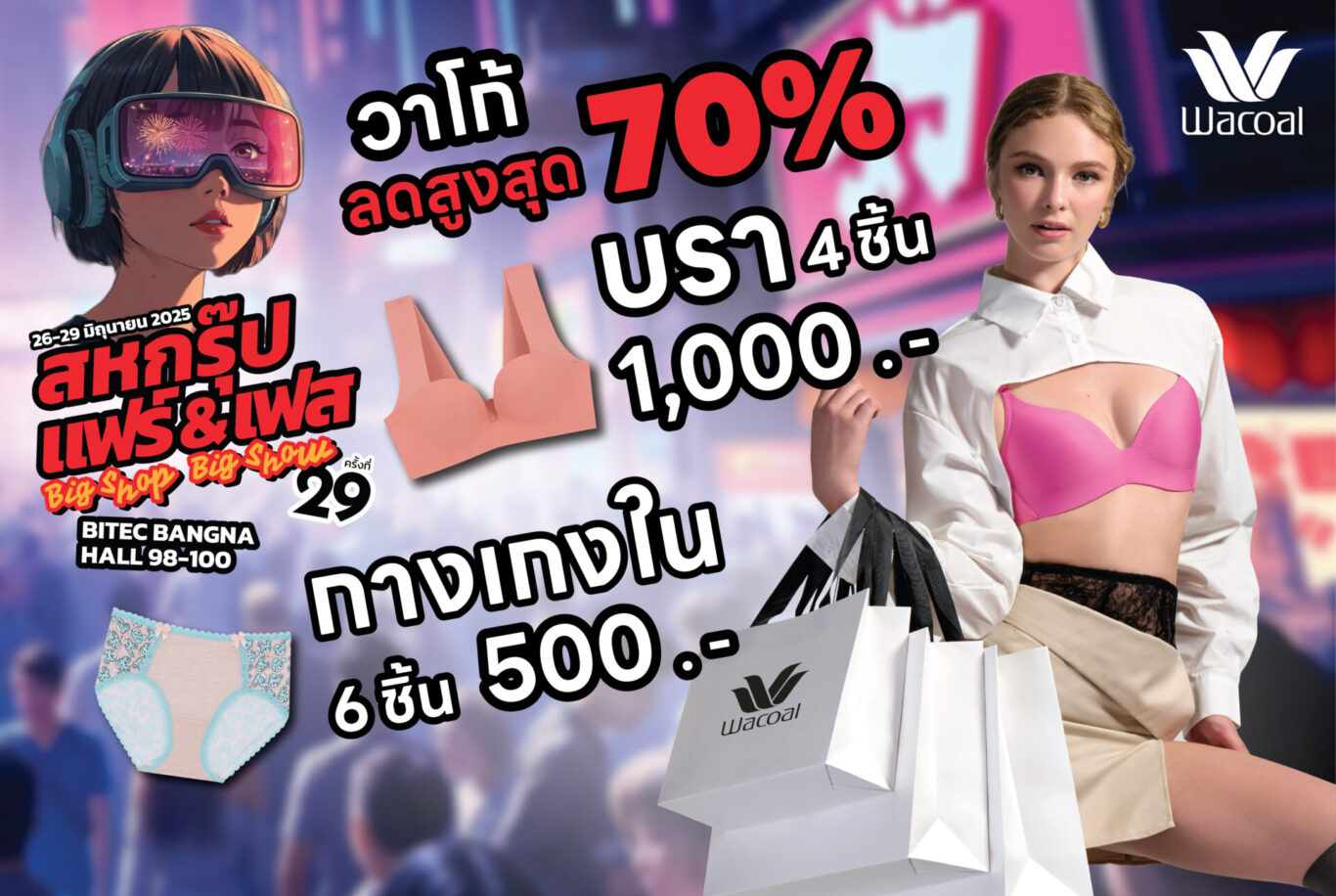 เตรียมตัวให้พร้อม! วาโก้ ขนทัพสินค้าแบรนด์ดังลดราคาสุดพิเศษ สูงสุด 70% อาทิ บราเริ่มต้น 290 บาท เซ็ต 4 ชิ้น 1,000 บาท Wacoal bloom/Wacoal Teen 250 บาท กางเกงใน 6 ชิ้น 500 บาท ชุดกระชับสัดส่วน ชุดนอนใส่สบาย และชุดออกกำลังกาย เริ่มต้นชิ้นละ 390 บาท ในงานสหกรุ๊ปแฟร์ ครั้งที่ 29 โดยความพิเศษในปีนี้ วาโก้มาในคอนเซ็ปต์ “PRIDE OF WACOAL” วาโก้ภูมิใจในสิ่งที่ทำ ภูมิใจในคุณภาพและนวัตกรรมสินค้า และภูมิใจที่ได้สวมใส่ชุดชั้นในที่ใส่ใจทั้ง “คุณและโลก” เพราะวาโก้ทุกชิ้นผ่านกระบวนการผลิตที่เป็นมิตรต่อสิ่งแวดล้อม เปิดตัวคอลเลกชันใหม่ Wacoal X Sahred Toy เสื้อผ้าและสินค้าลวดลายผสมผสานความเชื่อมูเตลูกับแฟชั่นเข้าไว้ด้วยกัน อาทิ เสื้อทีเชิ๊ต เสื้อกล้าม กระเป๋าผ้า ร่มกันแดดกันฝน และGriptok เป็นต้น