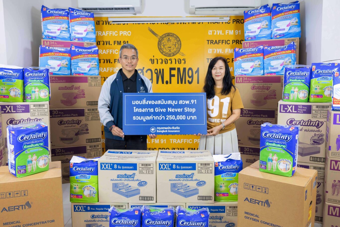 กรุงเทพประกันภัยให้การสนับสนุนโครงการ GIVE NEVER STOP มอบอุปกรณ์ช่วยชีวิต ซึ่งจัดโดยสถานีวิทยุ สวพ.FM91 อย่างต่อเนื่องมานานกว่า 10 ปี โดยมีวัตถุประสงค์เพื่อส่งมอบความช่วยเหลือด้านสุขภาพแก่ผู้ยากไร้และขาดแคลนในสังคมไทย สำหรับอุปกรณ์ที่มอบในครั้งนี้ ได้แก่ ถังออกซิเจน ผ้าอ้อมผู้ใหญ่ แผ่นรองซับ และอุปกรณ์ที่จำเป็นต่อการดูแลสุขภาพอื่น ๆ ซึ่งเป็นสิ่งจำเป็นสำหรับผู้ป่วย ผู้สูงอายุ หรือผู้ที่มีข้อจำกัดทางสุขภาพ เพื่อส่งเสริมคุณภาพชีวิตให้ดียิ่งขึ้น