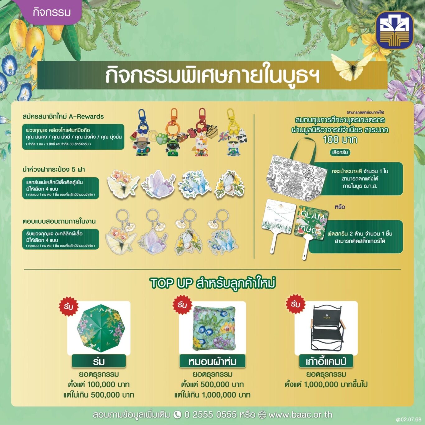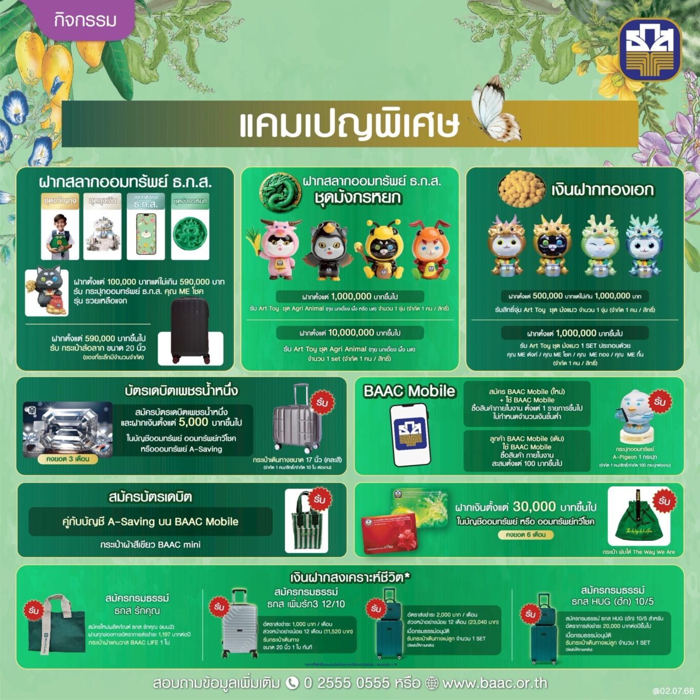 เพียงฝากสลากออมทรัพย์ ธ.ก.ส. ชุดมังกรหยก หน่วยละ 100 บาท ตั้งแต่ 1,000,000 บาทขึ้นไป รับสิทธิ์จุ่ม Art Toy ชุด AGRI ANIMAL (ทุย นกเอี้ยง ผึ้ง และ มด) จำนวน 1 จุ่ม (จำกัด 1 คน/สิทธิ์) หรือเมื่อฝากตั้งแต่ 10,000,000 บาทขึ้นไป รับเลย 4 ตัว ครบเซต (จำกัด 1 คน/สิทธิ์) และเมื่อฝากเงินฝากทองเอก ตั้งแต่ 500,000 บาทแต่ไม่เกิน 1,000,000 บาท รับสิทธิ์จุ่ม Art Toy ชุดมังแมว 1 จุ่ม และเมื่อฝากตั้งแต่ 1,000,000 บาทขึ้นไป รับเลย Art Toy ชุดมังแมวครบเซต 4 ตัว หรือเมื่อฝากสลากออมทรัพย์ ธ.ก.ส. ชุดมังกรหยก หน่วยละ 100 บาท ชุดถุงเงินหน่วยละ 100 บาท ชุดขวัญถุง หน่วยละ 20 บาท หรือสลากดิจิทัล ธ.ก.ส. หน่วยละ 50 บาท ตั้งแต่ 100,000 บาทขึ้นไป รับกระปุกออมทรัพย์ คุณ ME โชค รุ่นรวยเหลือแจก หรือเมื่อฝากตั้งแต่ 590,000 บาทขึ้นไป รับเลยกระเป๋าล้อลาก ขนาด 20 นิ้ว