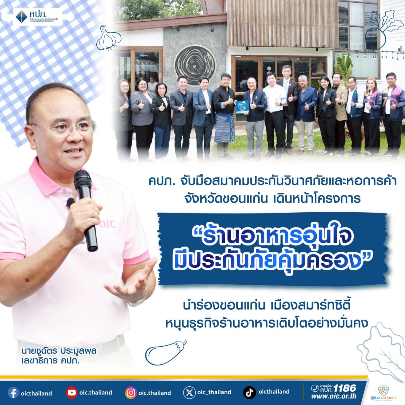 เมื่อวันที่ 2 กรกฎาคม 2568 สำนักงานคณะกรรมการกำกับและส่งเสริมการประกอบธุรกิจประกันภัย (สำนักงาน คปภ.) ร่วมกับ สมาคมประกันวินาศภัยไทย และ หอการค้าจังหวัดขอนแก่น เปิดตัวโครงการนำร่อง “ร้านอาหารอุ่นใจ มีประกันภัยคุ้มครอง” โดยมี นายชูฉัตร ประมูลผล เลขาธิการ คปภ. เป็นผู้มอบป้ายตราสัญลักษณ์ให้แก่ผู้ประกอบการร้านอาหารนำร่องที่มีการบริหารความเสี่ยงอย่างมีประสิทธิภาพด้วยระบบการประกันภัย รองรับการเติบโตทางเศรษฐกิจ และสร้างความมั่นใจให้กับลูกค้าในพื้นที่จังหวัดขอนแก่น ซึ่งถือเป็นหนึ่งในจังหวัดที่มีศักยภาพทางเศรษฐกิจสูงสุดของประเทศ