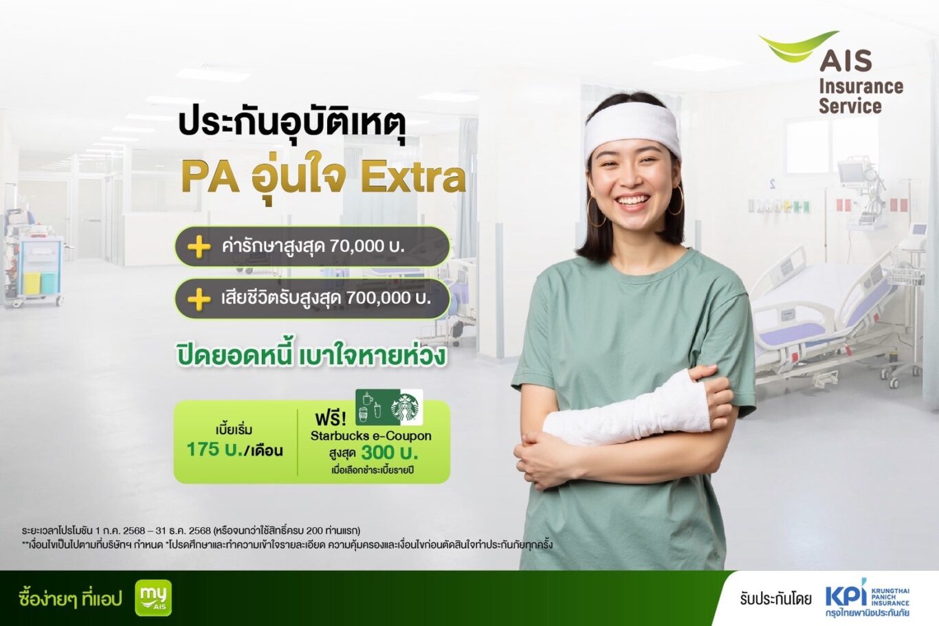 นอกจากนี้ แผนประกันภัย “PA อุ่นใจ Extra” ยังช่วย “ปิดยอดหนี้ เบาใจหายห่วง” ด้วยความคุ้มครองภาระหนี้สินกรณีเสียชีวิตสูงสุดถึง 70,000 บาท หมดกังวลเรื่องภาระหนี้สินของครอบครัว แผนประกันอุบัติเหตุ “PA อุ่นใจ Extra” พร้อมมอบความอุ่นใจแบบ Extra ด้วยเบี้ยเริ่มต้นเพียง 175 บาท ลูกค้าที่สนใจสามารถคลิกซื้อได้ที่ แอปพลิเคชัน myAIS ตั้งแต่วันที่ 1 กรกฎาคม ถึง 31 ธันวาคม 2568 เป็นต้นไป
