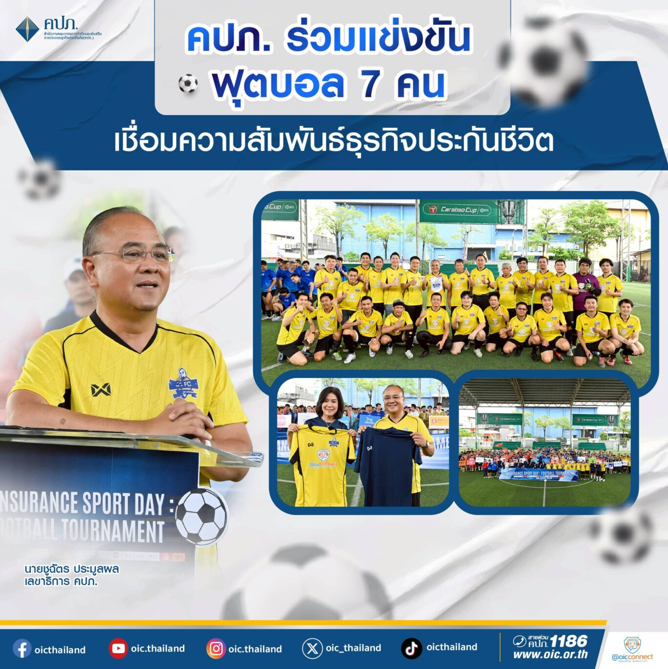 สำนักงาน คปภ. ร่วมการแข่งขันฟุตบอล 7 คน เชื่อมความสัมพันธ์ธุรกิจประกันชีวิต ประจำปี 2568 เสริมสร้างความสัมพันธ์อันดีระหว่างกัน ซึ่งเป็นส่วนหนึ่งในการขับเคลื่อนอุตสาหกรรมประกันภัยให้ก้าวหน้าและมั่นคงยิ่งขึ้นสำนักงานคณะกรรมการกำกับและส่งเสริมการประกอบธุรกิจประกันภัย (สำนักงาน คปภ.) ร่วมกับ สมาคมประกันชีวิตไทย จัดการแข่งขันฟุตบอล 7 คน เชื่อมความสัมพันธ์ธุรกิจประกันชีวิต ณ สนาม Super Star Arena ลาดพร้าว 80 โดยมี