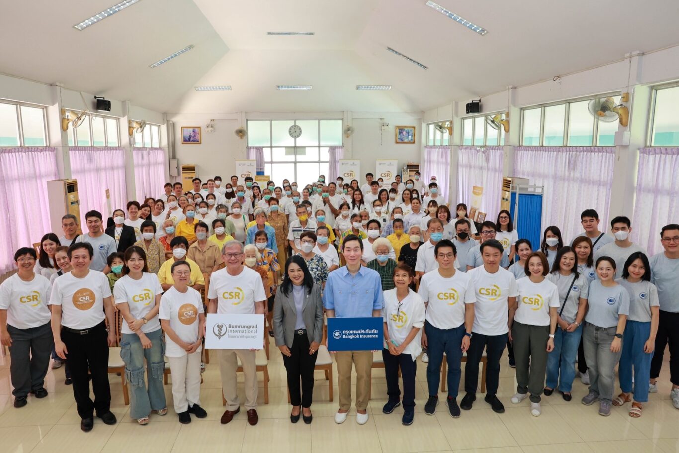 โอกาสนี้โรงพยาบาลบำรุงราษฎร์นำทีมบุคลากรทางการแพทย์ที่มีความรู้ความเชี่ยวชาญในสาขาต่างๆ ทั้งแพทย์อายุรกรรม แพทย์กระดูกและข้อ จักษุแพทย์ พยาบาล นักกายภาพบำบัด และเภสัชกร จำนวนรวมกว่า 60 คนร่วมออกหน่วยแพทย์เคลื่อนที่ภายใต้ชื่อ “อาสาบำรุงราษฎร์” ให้บริการตรวจสุขภาพแก่ผู้สูงอายุโดยไม่มีค่าใช้จ่าย เพื่อส่งเสริมให้ผู้สูงอายุมีโอกาสเข้าถึงการรักษาพยาบาลที่มีคุณภาพและมีมาตรฐานภายในงานทีมจิตอาสาของกรุงเทพประกันภัย ยังได้จัดกิจกรรมสันทนาการให้ผู้สูงอายุได้ร่วมเกมสนุกสนานอย่างสนุกสนานเพลิดเพลิน พร้อมจัดเลี้ยงอาหารกลางวันให้แก่ผู้สูงอายุได้อิ่มอร่อยกันอีกด้วย