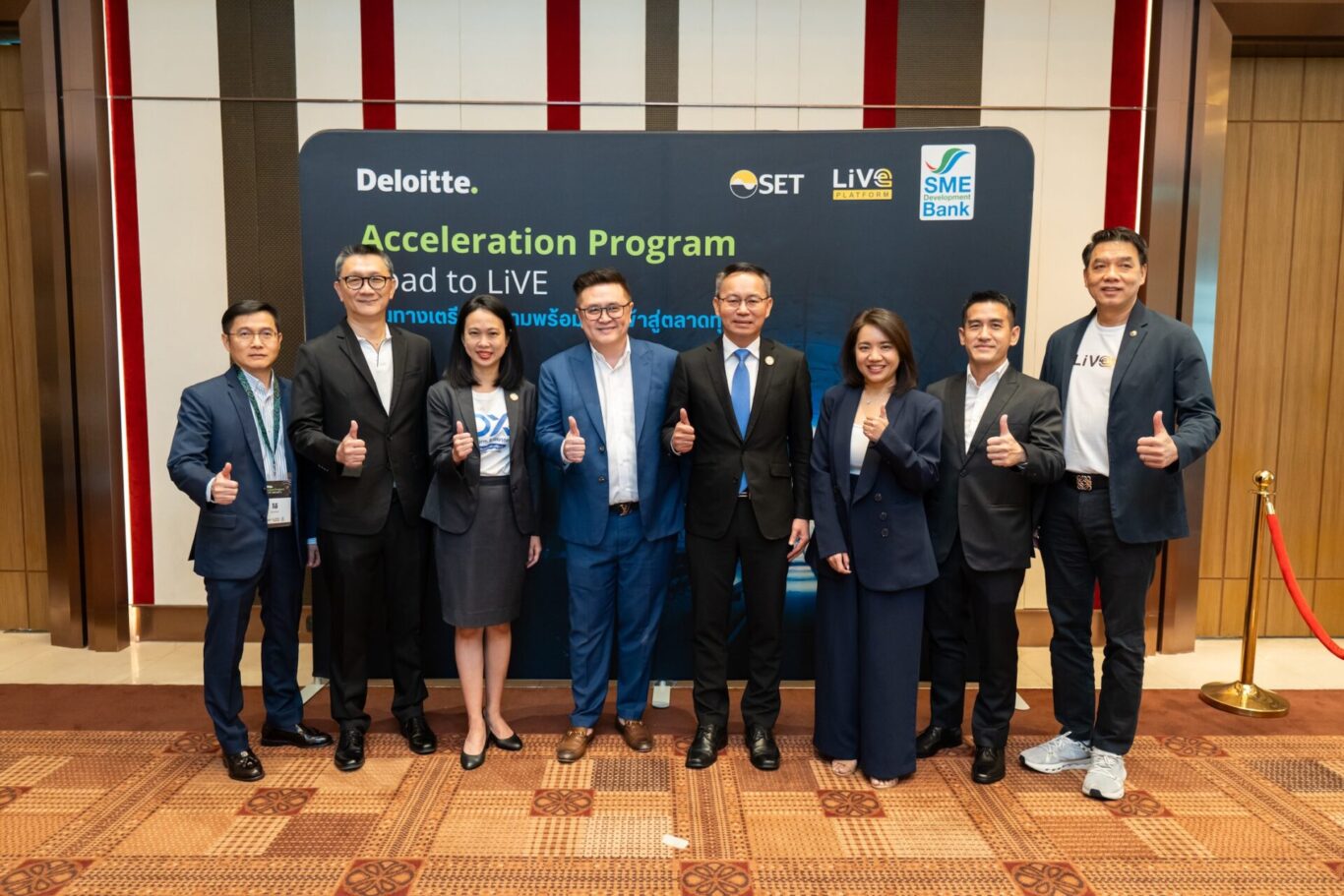 ดีลอยท์ ประเทศไทย ร่วมกับ ธนาคารพัฒนาวิสาหกิจ และ LiVE จัดงานปฐมนิเทศ “Acceleration Program – Road to LiVE รุ่นที่ 3” โครงการเสริมความพร้อมที่สำคัญของผู้ประกอบการในการเข้าตลาดทุน ณ ห้องสุรศักดิ์ บอลรูม โรงแรม อีสติน แกรนด์ สาทร โดยมี นายชวาลา เทียนประเสริฐกิจ Audit Leader ดีลอยท์ ประเทศไทย (ที่สองจากซ้าย) นายพิชิต มิทราวงศ์ กรรมการผู้จัดการ ธนาคารพัฒนาวิสาหกิจขนาดกลางและขนาดย่อมแห่งประเทศไทย (ที่สี่จากขวา) และ นายประพันธ์ เจริญประวัติ ผู้ช่วยผู้จัดการสายงานผู้ออกหลักทรัพย์, ผู้จัดการตลาดหลักทรัพย์ เอ็ม เอ ไอ, ผู้จัดการตลาดหลักทรัพย์ไลฟ์เอ็กซ์เช้นจ์ และกรรมการผู้จัดการบริษัท ไลฟ์ฟินคอร์ป จำกัด (ที่หนึ่งจากขวา) ร่วมเป็นประธานเปิด