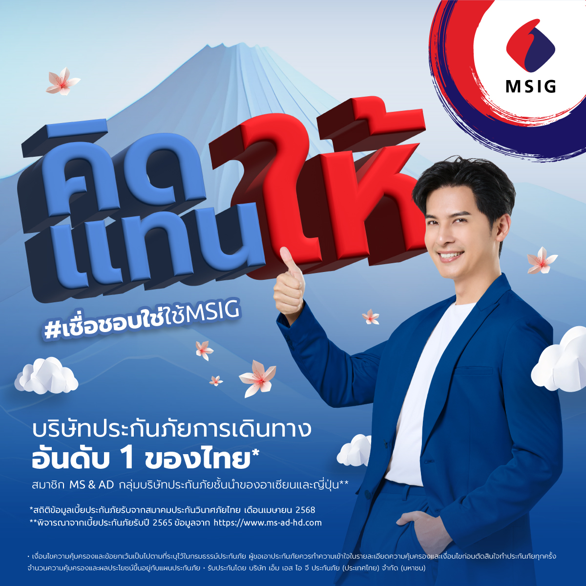 กรุงเทพฯ, 14 กรกฎาคม 2568 บริษัท เอ็ม เอส ไอ จี ประกันภัย (ประเทศไทย) จำกัด (มหาชน) เปิดตัวแคมเปญโฆษณาใหม่ล่าสุด “คิดแทนให้” ต่อยอดจากความสำเร็จของแคมเปญ “เชื่อ ชอบ ใช่” ที่เปิดตัวไปเมื่อปีก่อน โดยยังคงสื่อสารผ่านแบรนด์พรีเซนเตอร์ แคน – อติรุจ กิตติพัฒนะ พิธีกรและผู้ประกาศข่าวมากความสามารถที่กลับมาเป็นตัวแทนของแบรนด์เป็นปีที่ 2