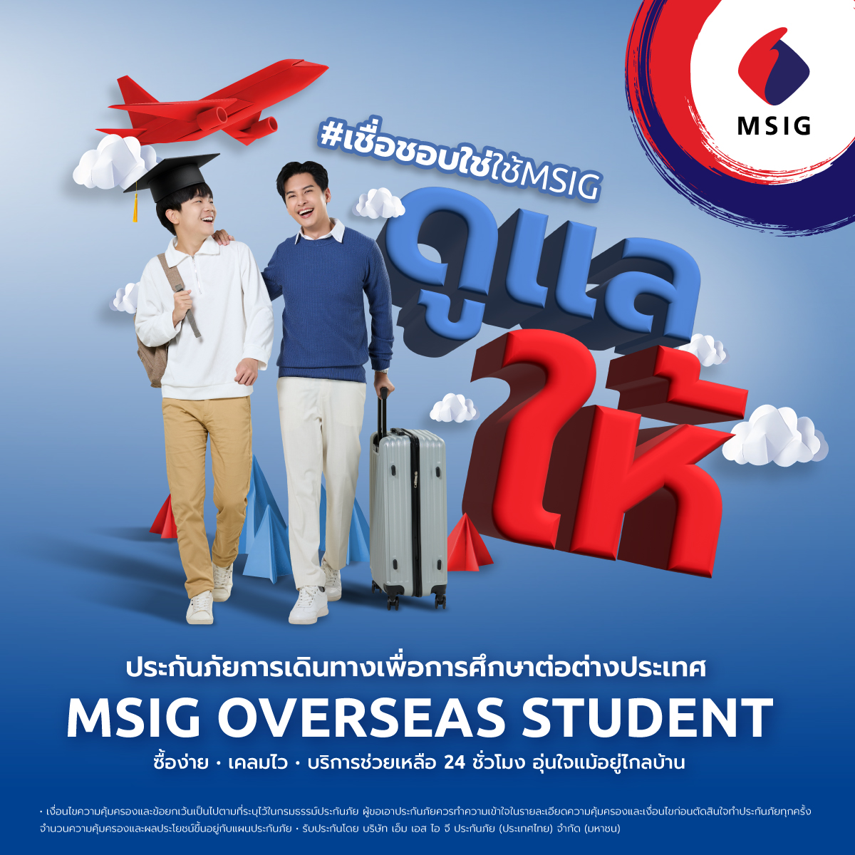 1. MSIG Overseas Studentประกันภัยการเดินทางเพื่อการศึกษาต่อต่างประเทศ สำหรับนักเรียน นักศึกษาที่เรียนต่อต่างประเทศ เพื่อช่วยดูแลทั้งสุขภาพและเหตุฉุกเฉินระหว่างเดินทาง“เพราะการส่งลูกไปเรียนต่อ…ไม่ใช่แค่เรื่องการศึกษา แต่คือความอุ่นใจที่คิดแทนให้ครบ”
