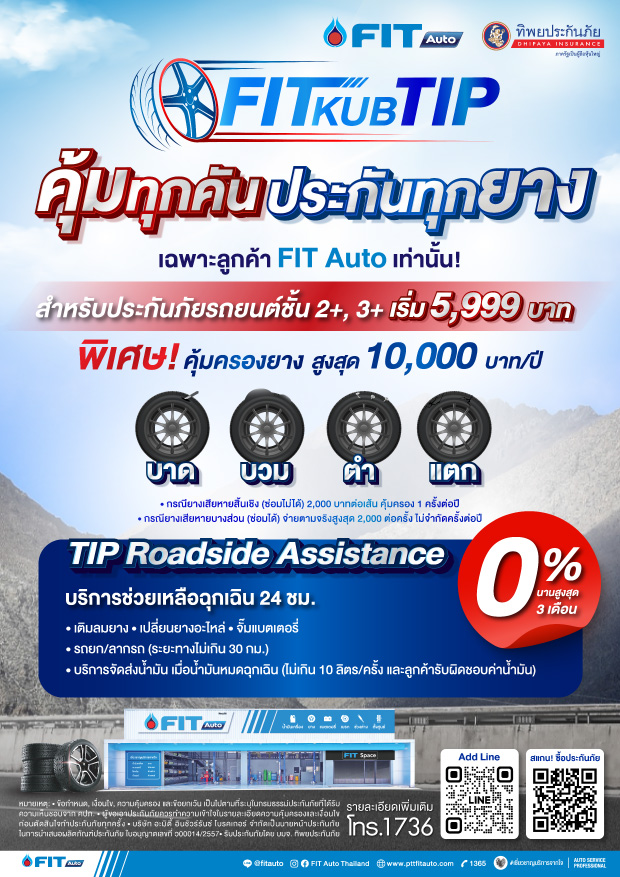 สุภาพ ประดับการ รองกรรมการผู้จัดการใหญ่ บริษัท ทิพยประกันภัย จำกัด (มหาชน) รชา อุทัยจันทร์ รองประธานเจ้าหน้าที่บริหารด้านธุรกิจหล่อลื่น บริษัท ปตท. น้ำมันและการค้าปลีก จำกัด (มหาชน) (OR) และ ธีรวัฒน์ ตั้งเสรี กรรมการผู้จัดการ บริษัท อะมิตี้ อินชัวร์รันซ์ โบรคเกอร์ จำกัด ร่วมลงนามบันทึกข้อตกลงความร่วมมือ (MOU) ในโครงการ “FIT KUB TIP คุ้มทุกคัน ประกันทุกยาง” เพื่อยกระดับประกันภัยรถยนต์แบบ One Stop Service ให้กับลูกค้า โดยให้บริการเฉพาะที่ FIT Auto ทุกสาขาทั่วประเทศโครงการ “FIT KUB TIP คุ้มทุกคัน ประกันทุกยาง” เป็นการพัฒนาผลิตภัณฑ์ประกันภัยรถยนต์ที่ตอบโจทย์ความต้องการของผู้บริโภคยุคใหม่ ซึ่งมองหาทั้งความสะดวกสบายและความอุ่นใจในทุกการเดินทาง
