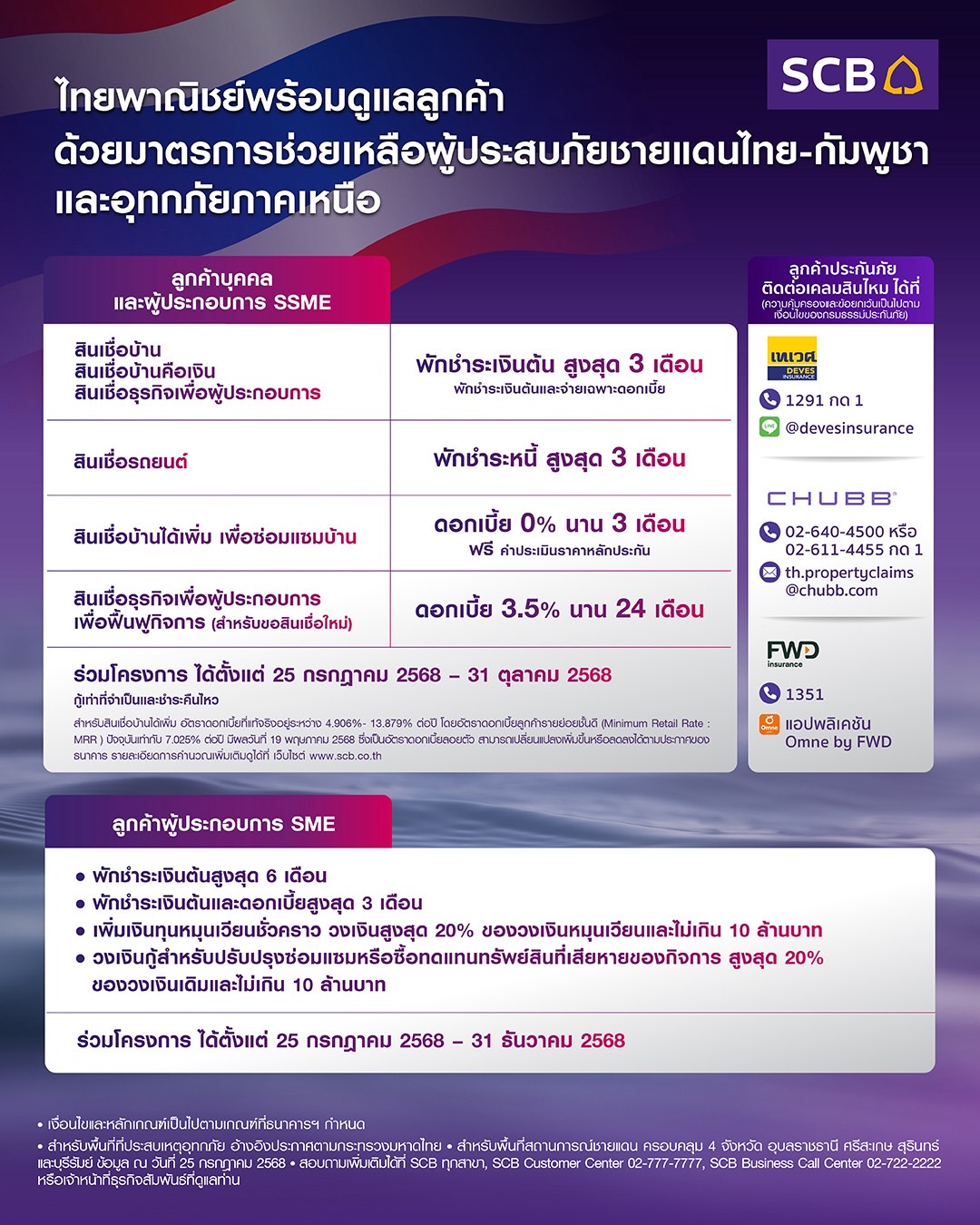ธนาคารไทยพาณิชย์ ออกมาตรการเร่งด่วนเพื่อช่วยเหลือลูกค้าที่ได้รับผลกระทบจากสถานการณ์ความขัดแย้งระหว่างไทยและกัมพูชา และอุทกภัยในพื้นที่ภาคเหนือ โดยให้ความช่วยเหลือทั้งกลุ่มลูกค้าบุคคล ลูกค้าสินเชื่อธุรกิจเพื่อผู้ประกอบการและลูกค้าผู้ประกอบการ SME ทั้งมาตรการพักชำระและสินเชื่อพิเศษเพื่อซ่อมแซมบ้านและกิจการอย่างเต็มที่ จากสถานการณ์ ความขัดแย้งระหว่างไทยและกัมพูชาและสถานการณ์อุทกภัยฉับพลันจากอิทธิพลของพายุ “วิภา” ที่เกิดขึ้น ซึ่งส่งผลกระทบอย่างรุนแรงต่อทรัพย์สินและความเป็นอยู่ของประชาชนในหลายพื้นที่ทั่วประเทศ