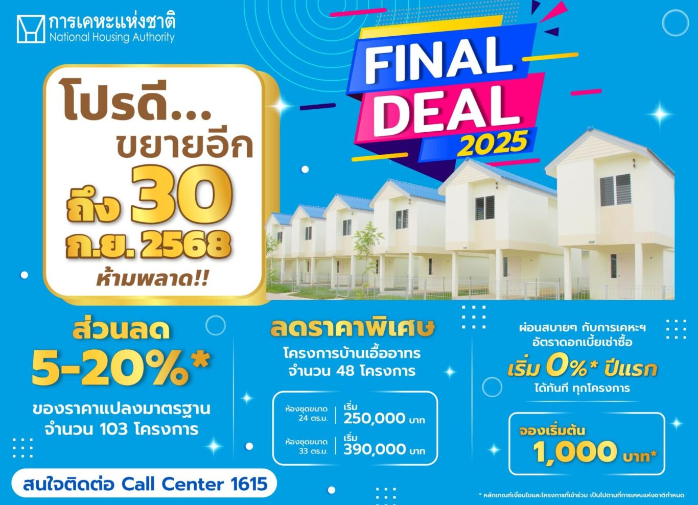 นายทวีพงษ์ วิชัยดิษฐ ผู้ว่าการการเคหะแห่งชาติ เปิดเผยว่า จากความสำเร็จของแคมเปญก่อนหน้าที่ได้รับความสนใจอย่างล้นหลาม แต่ยังไม่สามารถรองรับความต้องการของประชาชนได้อย่างเพียงพอ การเคหะแห่งชาติได้จัดทำแคมเปญ “Final Deal 2025” ขึ้น เพื่อขยายโอกาสให้ประชาชนสามารถเข้าถึงที่อยู่อาศัยได้ครอบคลุมมากยิ่งขึ้น แคมเปญ “Final Deal 2025” ถือเป็นโอกาสสำคัญและเป็นครั้งสุดท้ายของปีที่ประชาชนสามารถเป็นเจ้าของบ้านในฝันได้จริง ภายใต้เงื่อนไขที่ดีที่สุด ทั้งในด้านราคา อัตราดอกเบี้ย และสิทธิประโยชน์ต่าง ๆ โดยมีโครงการเข้าร่วมกระจายทั่วประเทศ ครอบคลุมพื้นที่กรุงเทพฯ ปริมณฑล ได้แก่ โครงการเคหะชุมชนบางพลี วาระ 2, บ้านเอื้ออาทรรามอินทรา (คู้บอน) เฟส 1, เคหะชุมชนนครปฐม ระยะ 2, เคหะชุมชนและบริการชุมชนนนทบุรี (วัดกู้ 3), เคหะชุมชนและบริการชุมชนลาดกระบัง 2 ระยะ 3/1 และภูมิภาค ได้แก่ โครงการเคหะชุมชนและบริการชุมชนจังหวัดชลบุรี (ห้วยกะปิ) เคหะชุมชนและบริการชุมชนขอนแก่น เมืองเก่า-กรีนวิลล์ ระยะ 1, เคหะชุมชนและบริการชุมชนจังหวัดกระบี่ (กระบี่น้อย), เคหะชุมชนและบริการชุมชนจังหวัดอุดรธานี (สามพร้าว) ระยะที่ 1 เป็นต้น