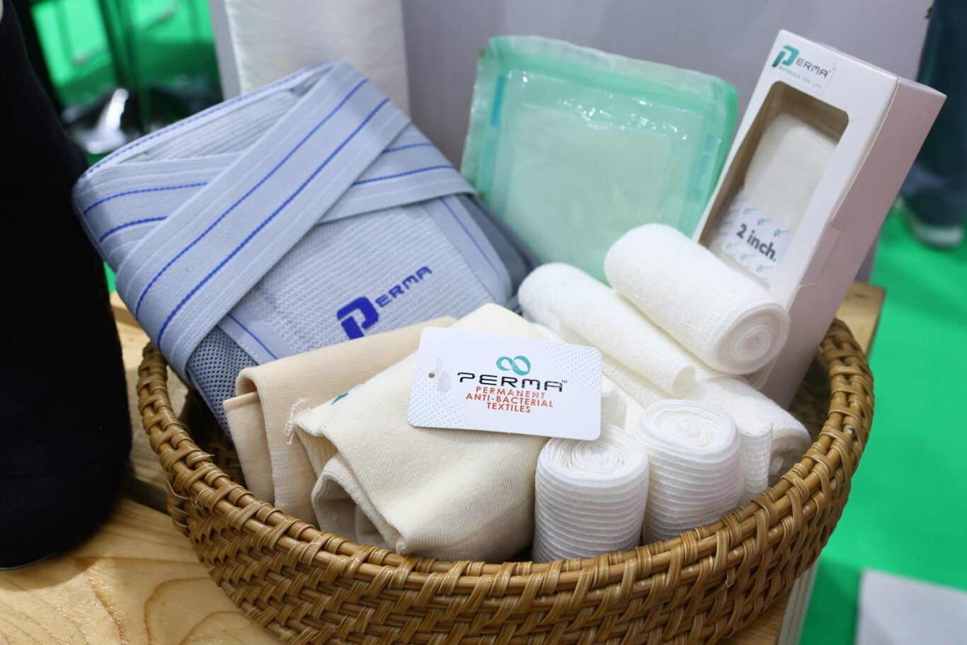 • บริษัท PERMA จำกัด (บูธหมายเลข F27) บริษัทผลิตเส้นใย ไม่ใช่เส้นใยที่นำไปทำสิ่งทอหรือเครื่องนุ่งห่มธรรมดา ๆ แต่เป็นเส้นใยพิเศษที่มีความสามารถในการยับยั้งแบคทีเรีย นั่นคือเส้นใยแบบ non-woven ที่สามารถขึ้นรูปเป็นแผ่นได้หน้ากว้างถึง 1 เมตรกันเลยทีเดียว และยังคงคุณสมบัติแม้จะผ่านการซักน้ำนับร้อยครั้ง ทำให้เส้นใย non-woven ที่ว่านี้ นำไปต่อยอดในอุตสาหกรรมอื่น ๆ ได้อีกหลายประเภท เช่น