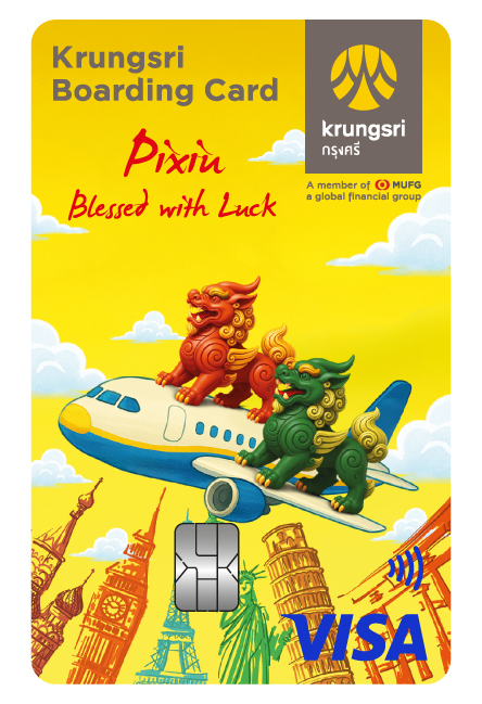 • บัตร Krungsri Boarding Card ลายปี่เซียะ สำหรับลูกค้าสายมูติดเที่ยวที่ต้องการความคุ้มค่าในทุกการใช้จ่ายทั้งในและต่างประเทศ แลกเงินเรทพิเศษครอบคลุมถึง 16 สกุลเงินหลัก ตั้งซื้อเรทถูกใจได้ล่วงหน้า แลกให้แบบอัตโนมัติ พร้อมโปรโมชันมากมายตลอดปี ฟรี! ค่าธรรมเนียมสมัครบัตร มูลค่า 150 บาท เมื่อสมัครบัตร Krungsri Boarding Card ลายปี่เซียะ ผ่าน krungsri app และยืนยันเปิดใช้บัตรภายในระยะเวลาที่กำหนด