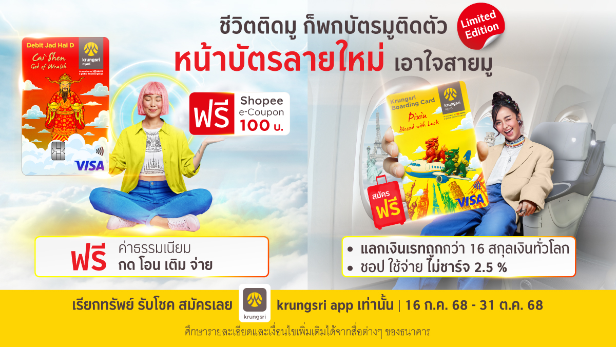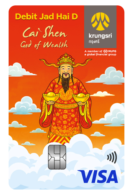 ผู้ที่สนใจสามารถดูรายละเอียดและเงื่อนไขเพิ่มเติมได้ที่สำหรับบัตรกรุงศรี เดบิต จัดให้ D ลายเทพเจ้าไฉ่ซิงเอี้ย: https://www.krungsri.com/th/promotions/cards/hot-promotion/jadhai-d-cai-shen สำหรับบัตร Krungsri Boarding Card ลายปี่เซียะ: www.krungsri.com/th/promotions/krungsri-boarding-card/pixiu-collection