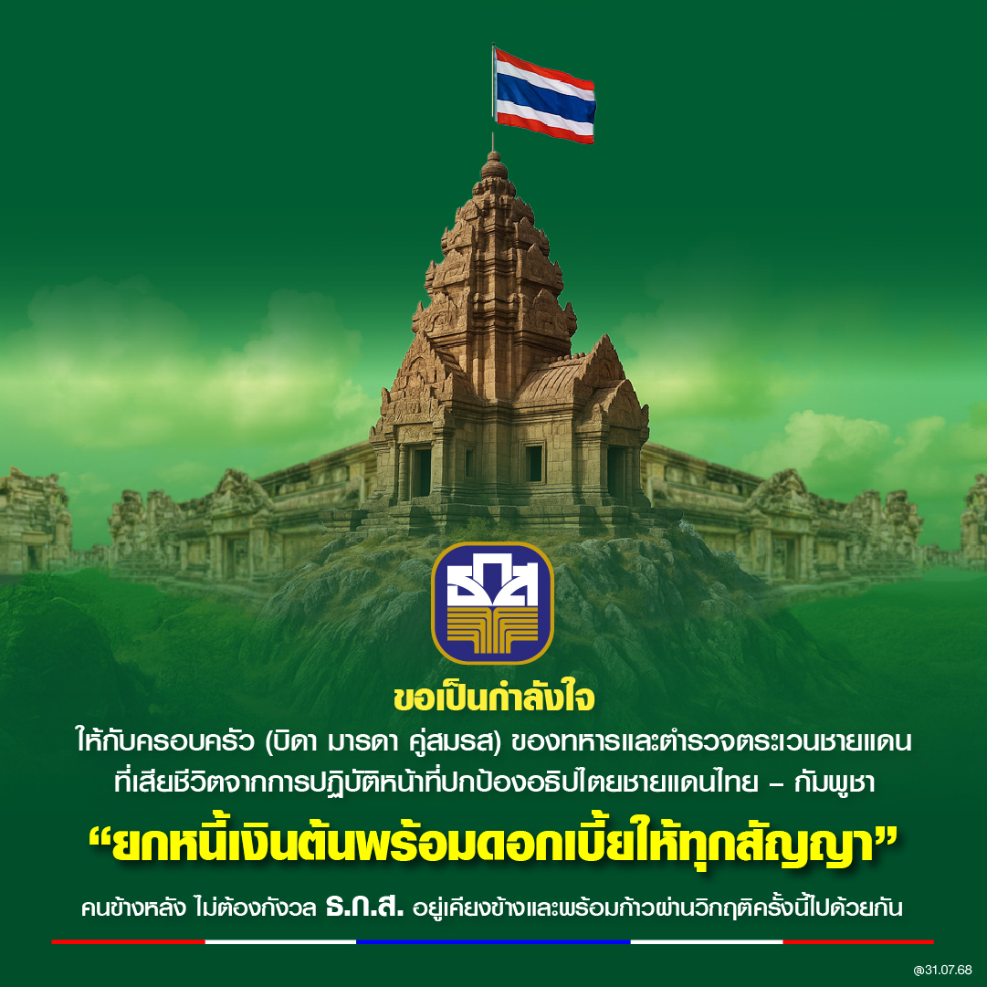นายฉัตรชัย ศิริไล ผู้จัดการ ธนาคารเพื่อการเกษตรและสหกรณ์การเกษตร (ธ.ก.ส.) เปิดเผยว่า จากสถานการณ์ความไม่สงบในพื้นที่ชายแดนไทย – กัมพูชา อันส่งผลกระทบอย่างรุนแรงต่อชีวิตความเป็นอยู่ ความปลอดภัยในชีวิตและทรัพย์สิน ของเกษตรกรลูกค้าของธนาคาร โดยมีทั้งทหารและประชาชนได้รับบาดเจ็บหรือเสียชีวิต ตลอดจนที่อยู่อาศัยรวมถึงพื้นที่ทำกินได้รับความเสียหาย และเพื่อให้ความช่วยเหลือและสงเคราะห์ลูกหนี้ และลดภาระให้สามารถดำรงชีพต่อไปได้อย่างมั่นคง นายจุลพันธ์ อมรวิวัฒน์ รัฐมนตรีช่วยว่าการกระทรวงการคลัง ในฐานะประธานกรรมการ ธ.ก.ส. เป็นประธาน ได้มีมติเห็นชอบการให้ความช่วยเหลือลูกหนี้ กรณีบุตร คู่สมรส ของลูกค้า ธ.ก.ส. ที่เป็นทหาร หรือ ตำรวจตระเวนชายแดน (ตชด.) ที่เสียชีวิตจากการปฏิบัติหน้าที่ในเหตุการณ์ความไม่สงบระหว่างประเทศไทย – กัมพูชา โดยธนาคารจะยกหนี้ในส่วนของต้นเงินกู้ทุกสัญญา และยกหนี้ในส่วนของดอกเบี้ยค้างรับและดอกเบี้ยปรับทั้งจำนวน ภายใต้สัญญาที่ใช้แหล่งเงินทุน ธ.ก.ส. เป็นกรณีพิเศษ