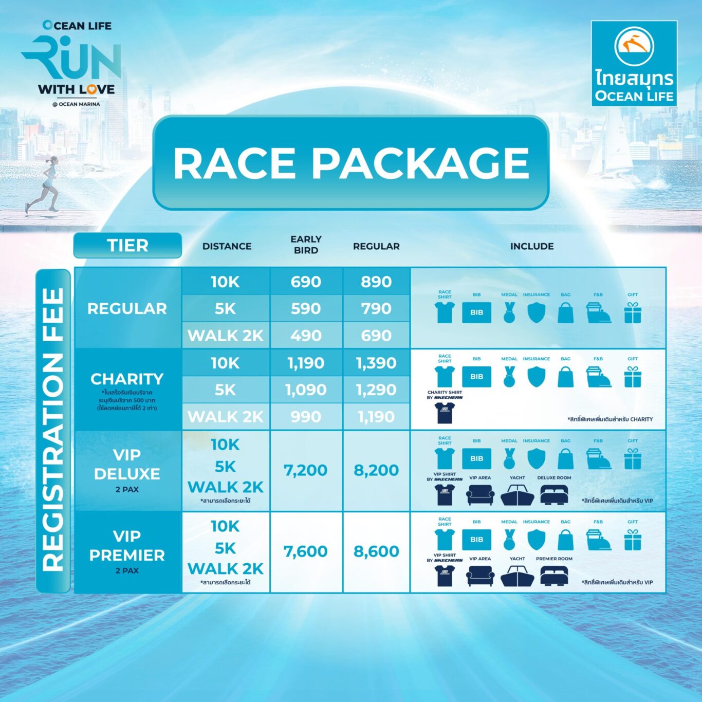 ค่าสมัครการร่วมกิจกรรม OCEAN LIFE Run With Love 2025 @OCEAN MARINA𝟭𝟬 𝗞𝗺. Mini Marathon – ค่าสมัคร Early Bird 690 บาท จากราคา Regular 890 บาท 𝟱 𝗞𝗺. Fun Run – ค่าสมัคร Early Bird 590 บาท จากราคา Regular 790 บาท 𝟮 𝗞𝗺. เดินรับลมชมวิวยอร์ช – ค่าสมัคร Early Bird 490 บาท จากราคา Regular 690 บาท 𝗖𝗵𝗮𝗿𝗶𝘁𝘆 𝗣𝗮𝗰𝗸𝗮𝗴𝗲 – เพิ่มค่าสมัครอีก 500 บาทจากระยะปกติ พร้อมรับใบเสร็จรับเงินบริจาค (ใช้ลดหย่อนภาษีได้ 2 เท่า) 𝗩𝗜𝗣 𝗗𝗲𝗹𝘂𝘅𝗲 𝗣𝗮𝗰𝗸𝗮𝗴𝗲 – ค่าสมัคร Early Bird 7,200 บาท จากราคา Regular 8,200 บาท𝗩𝗜𝗣 𝗣𝗿𝗲𝗺𝗶𝗲𝗿 𝗣𝗮𝗰𝗸𝗮𝗴𝗲 – ค่าสมัคร Early Bird 7,600 จากราคา Regular 8,600 บาท