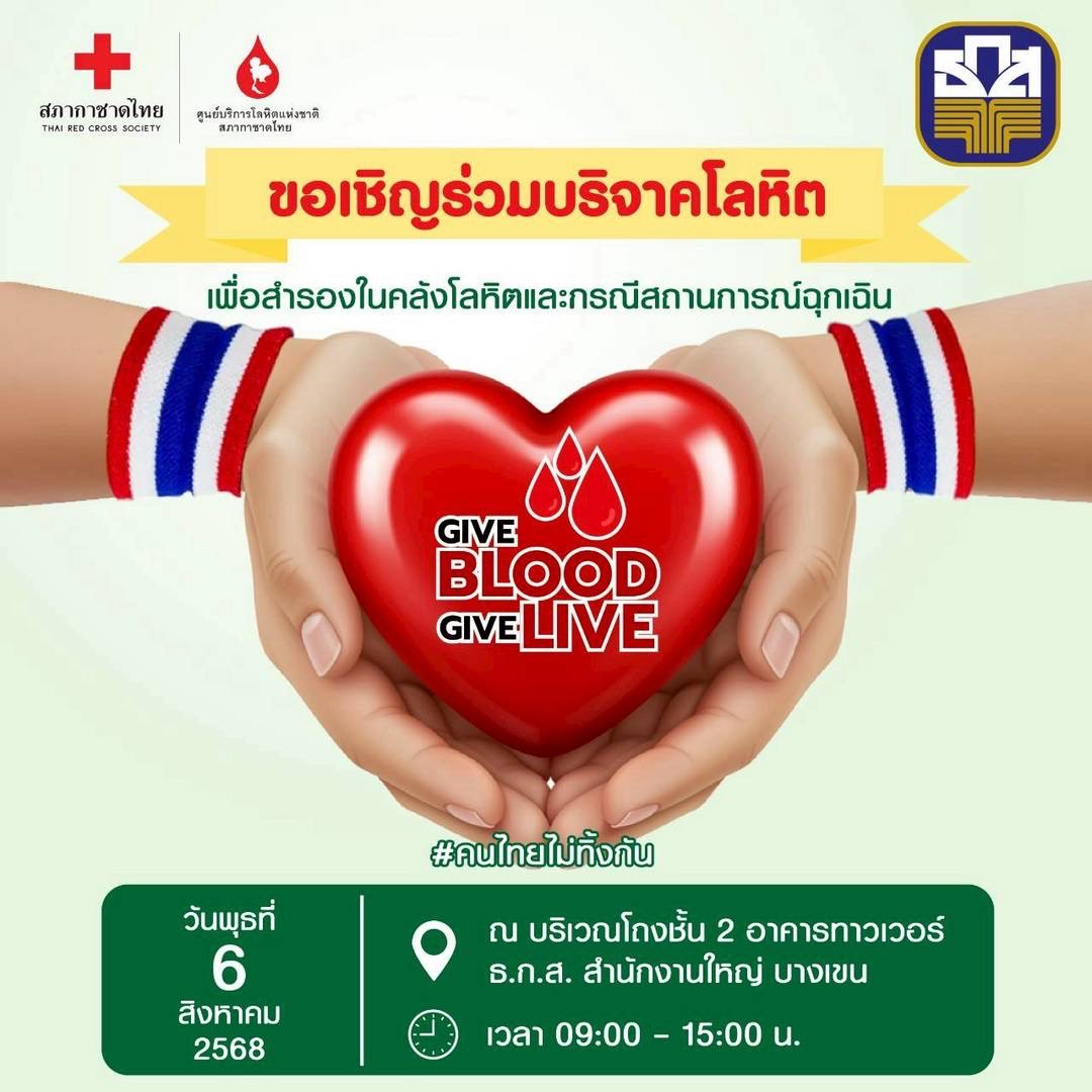 ธนาคารเพื่อการเกษตรและสหกรณ์การเกษตร (ธ.ก.ส.) ร่วมกับ ศูนย์บริการโลหิตแห่งชาติ สภากาชาดไทย ขอเชิญชวนประชาชน ลูกค้า และพนักงานธนาคารที่มีสุขภาพแข็งแรง ร่วมกันเป็นพลังแห่งการให้ด้วยการบริจาคโลหิต ในแคมเปญ “Give Blood Give Life” #คนไทยไม่ทิ้งกัน เพื่อเพิ่มปริมาณสำรองในคลังโลหิตให้เพียงพอต่อความ ต้องการ สำหรับส่งต่อไปใช้ในการรักษาพยาบาลผู้ป่วยทั่วประเทศให้ได้รับการรักษาอย่างทันท่วงที โดยเฉพาะการรักษาผู้ป่วยวิกฤตที่ต้องการโลหิตอย่างเร่งด่วน ทั้งการกรณีประสบอุบัติเหตุ การผ่าตัด รวมถึงกรณีเกิดสถานการณ์ ฉุกเฉินต่าง ๆ ภายในประเทศ ซึ่งถือเป็นการนำโลหิตนับเป็นของขวัญอันมีค่าที่สามารถช่วยต่อลมหายใจให้กับชีวิตของเพื่อนมนุษย์ได้ต่อไป