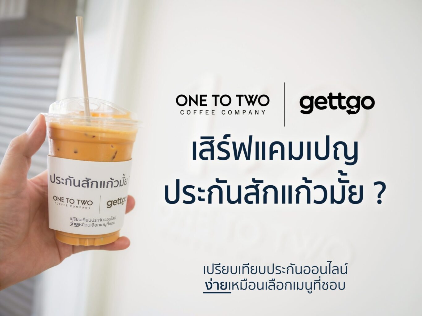 บริษัท เมืองไทย โบรกเกอร์ จำกัด ผู้ให้บริการ gettgo แพลตฟอร์มเปรียบเทียบประกันออนไลน์ ร่วมกับ 1:2 Coffee Company ร้านกาแฟขวัญใจชาวออฟฟิศ ที่เริ่มต้นจากจังหวัดเชียงรายและเติบโตสู่เมืองกรุง พร้อมชวนคนทุก Generation มาดื่มกาแฟชิล ๆ รับสิทธิ์ส่วนลดผ่านแคมเปญ “ประกันสักแก้วมั้ย?” และทำความรู้จักกับประกันในบรรยากาศสบาย ๆ ผ่านประสบการณ์การดื่มกาแฟที่ร้าน 1:2 Coffee กาแฟที่พรีเมียมในราคาที่เข้าถึงได้ กับประกันที่อยากให้ทุกคนเข้าถึงได้เช่นกัน