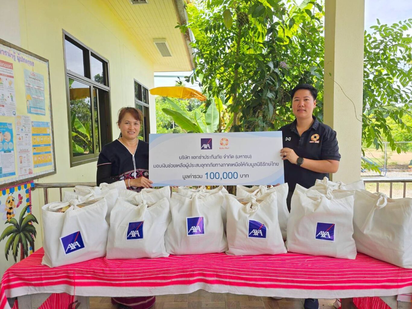 ภายใต้ความร่วมมือนี้ แอกซ่าประกันภัยได้มอบถุงยังชีพให้แก่เครือข่ายศูนย์พัฒนาเด็กและเยาวชนภายใต้การสนับสนุนของมูลนิธิรักษ์ไทยใน 4 จังหวัด ได้แก่ เชียงใหม่ เชียงราย ลำพูน และพะเยา โดยสิ่งของในถุงยังชีพประกอบด้วยของใช้จำเป็นสำหรับเด็กและครอบครัว เพื่อช่วยบรรเทาความเดือดร้อนและให้การสนับสนุนแก่กลุ่มเปราะบางในช่วงวิกฤต
