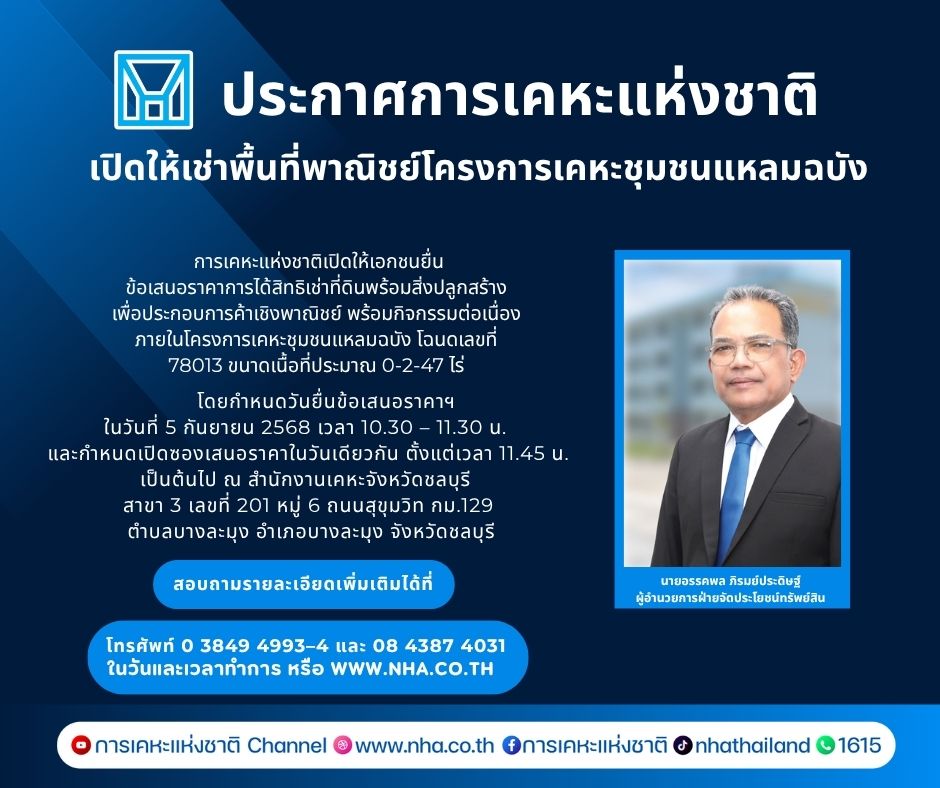 นายอรรคพล ภิรมย์ประดิษฐ์ ผู้อำนวยการฝ่ายจัดประโยชน์ทรัพย์สิน กล่าวว่า การเคหะแห่งชาติเปิดให้เอกชนยื่นข้อเสนอราคาการได้สิทธิเช่าที่ดินพร้อมสิ่งปลูกสร้าง เพื่อประกอบการค้าเชิงพาณิชย์พร้อมกิจกรรมต่อเนื่องภายในโครงการเคหะชุมชนแหลมฉบังของโฉนดเลขที่ 78013 ขนาดเนื้อที่ประมาณ 0-2-47 ไร่ (247 ตารางวา) เพื่อให้เกิดความโปร่งใสในการดำเนินงานทุกขั้นตอนตามหลักธรรมาภิบาล การเคหะแห่งชาติจึงเปิดโอกาสให้เอกชนที่สนใจสามารถยื่นข้อเสนอราคาการได้สิทธิเช่าที่ดินพร้อมสิ่งปลูกสร้างดังกล่าว โดยมีอัตราค่าธรรมเนียมการได้สิทธิเช่าขั้นต่ำไม่น้อยกว่า 260,000 บาท ระยะเวลาการให้สิทธิเช่า 6 ปี (ทำสัญญาคราวเดียว) ในอัตราค่าเช่ารายเดือน ปีที่ 1-3 เดือนละ 18,600 บาท (ปลอดค่าเช่า 6 เดือนแรก) ปีที่ 4-6 เดือนละ 20,400 บาท กำหนดหลักประกันการยื่นข้อเสนอราคาจำนวน 30,000 บาท กำหนดเงินประกันการปฏิบัติตามสัญญา เป็นเงิน 61,200 บาท