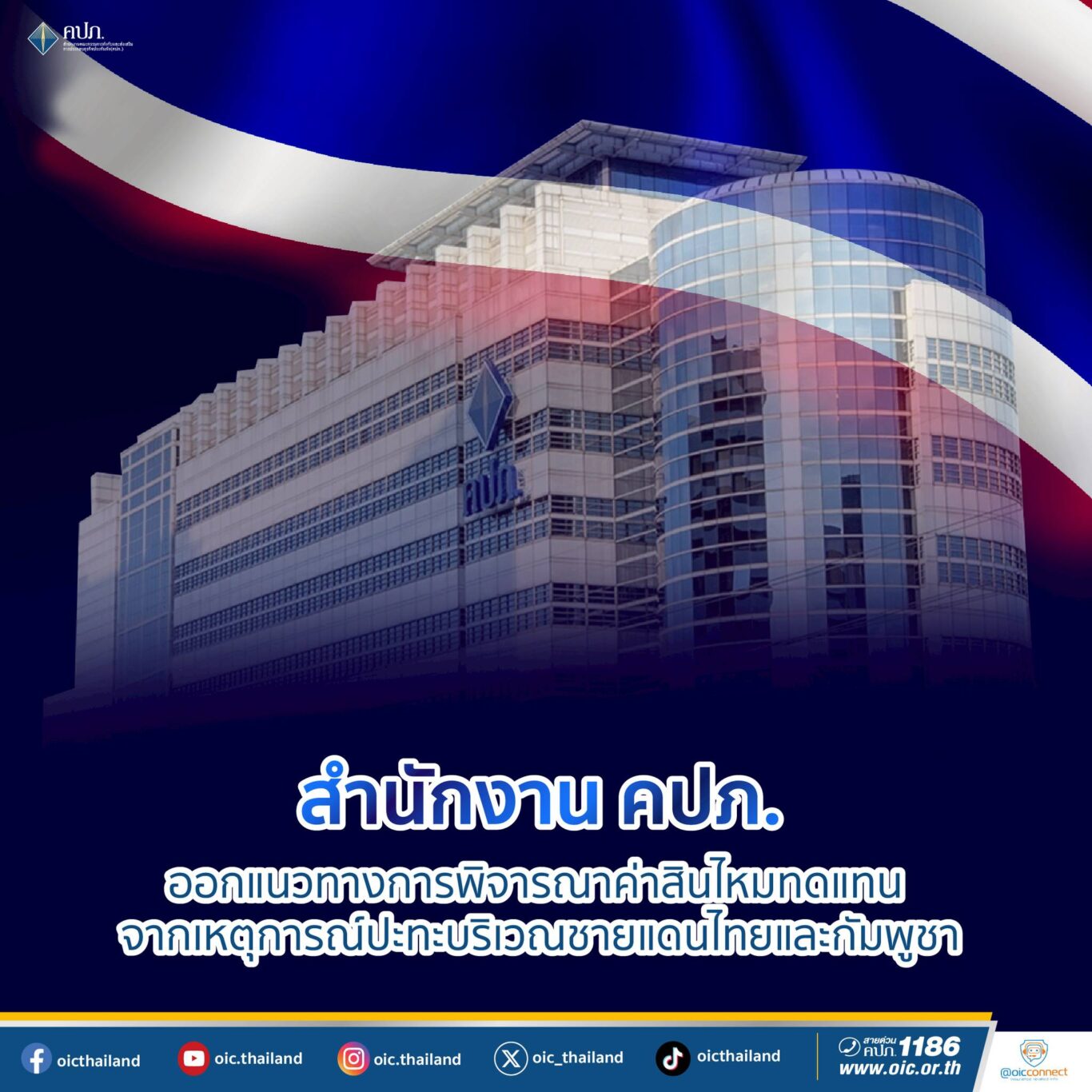 ตามที่ปรากฏข่าวเกี่ยวกับความตึงเครียดในพื้นที่ชายแดนระหว่างราชอาณาจักรไทยและราชอาณาจักรกัมพูชา โดยเฉพาะในจุดที่มีรายงานการเคลื่อนไหวของกำลังทหารและการเพิ่มระดับความรอบคอบทางยุทธศาสตร์ ซึ่งส่งผลให้พลเรือนในราชอาณาจักรไทยได้รับความเสียหายต่อชีวิต ร่างกาย อนามัย และทรัพย์สิน นั้น สำนักงานคณะกรรมการกำกับและส่งเสริมการประกอบธุรกิจประกันภัย (สำนักงาน คปภ.) ขอเรียนว่า เพื่อบรรเทาความเสียหายที่พลเรือนได้รับผลกระทบจากเหตุการณ์ดังกล่าว จึงขอให้บริษัทประกันภัยที่รับประกันภัยเร่งสำรวจความเสียหาย และหารือกับบริษัทประกันภัยต่อเกี่ยวกับแนวทางการตีความเงื่อนไขกรมธรรม์ประกันภัยให้ชัดเจน เพื่อพิจารณาการชดใช้ค่าสินไหมทดแทนโดยเร็ว