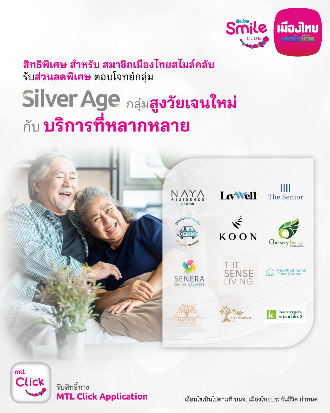 เมืองไทยประกันชีวิต โดย “เมืองไทยสไมล์คลับ” ผนึกกำลังพันธมิตรชั้นนำของประเทศ ตอบโจทย์กลุ่ม Silver Age ด้วยสิทธิพิเศษและบริการที่หลากหลาย ครอบคลุมทั้ง :