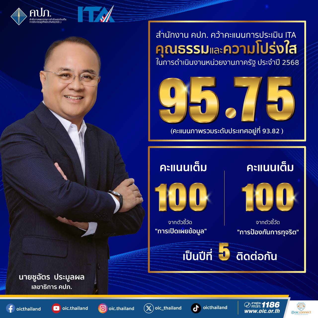 คปภ. ครองอันดับหน่วยงานโปร่งใส ITA ปี 2568 คว้า 95.75 คะแนน โชว์ศักยภาพเด่น: เปิดเผยข้อมูล-ป้องกันทุจริตได้เต็ม 100 คะแนน