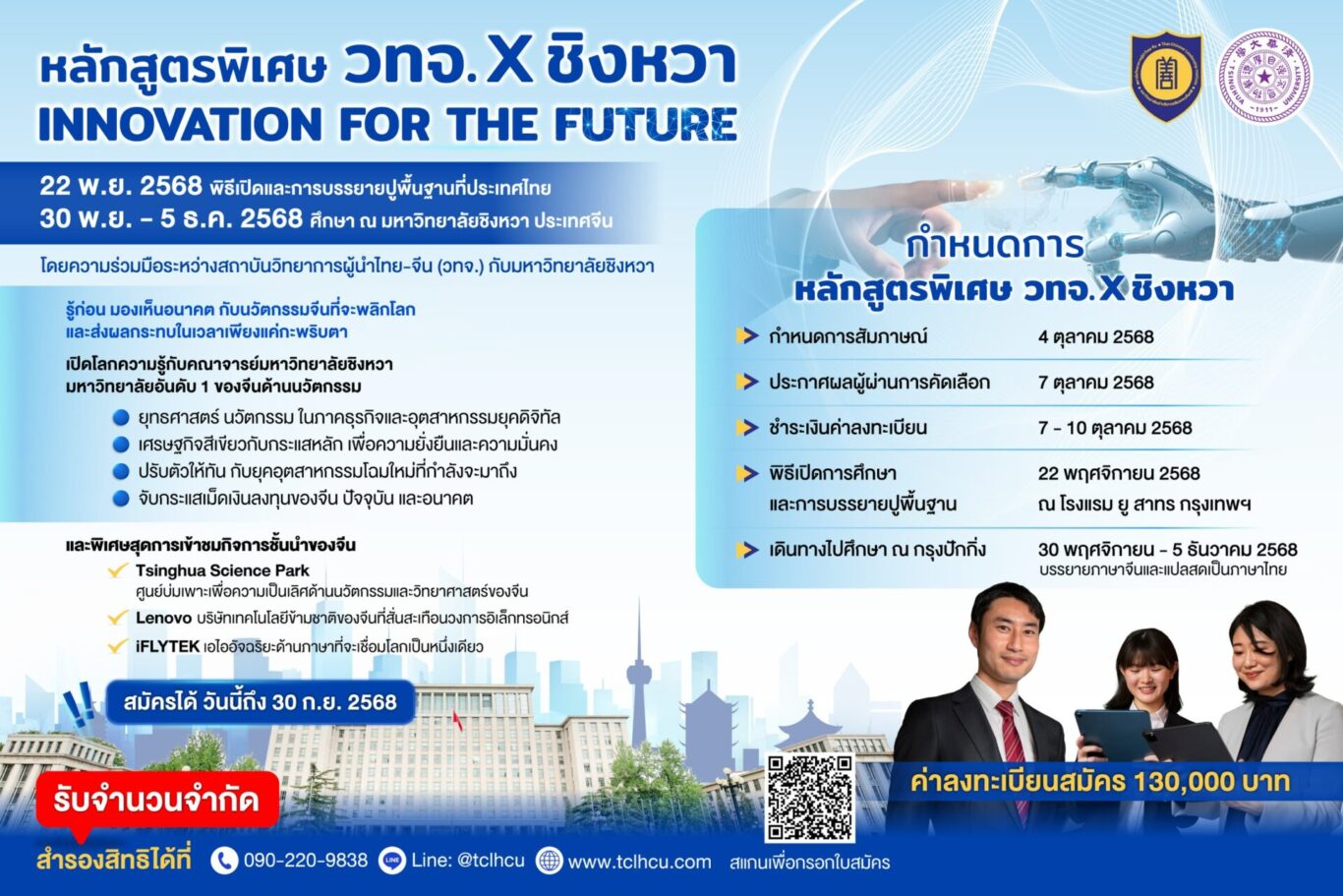 โดยผู้เข้าเรียนที่มีเวลาเรียนไม่น้อยกว่า 75% จะได้รับ Certificate of Participation จาก Tsinghua University มหาวิทยาลัยอันดับ 1 ของจีน และติดอันดับต้น ๆ ของโลกอย่างต่อเนื่อง ด้านนวัตกรรม AI, Industry 4.0 และ Green Economyเปิดรับสมัครทั้งบุคคลทั่วไปและศิษย์เก่า วทจ. จำนวนจำกัด! ตั้งแต่วันนี้ถึง 30 กันยายน 2568 โดยจะมีการสัมภาษณ์ในวันที่ 4 ตุลาคม และประกาศรายชื่อผู้ผ่านการคัดเลือกในวันที่ 7 ตุลาคม 2568 พร้อมทั้งชำระค่าลงทะเบียนวันที่ 7 – 10 ตุลาคม 2568