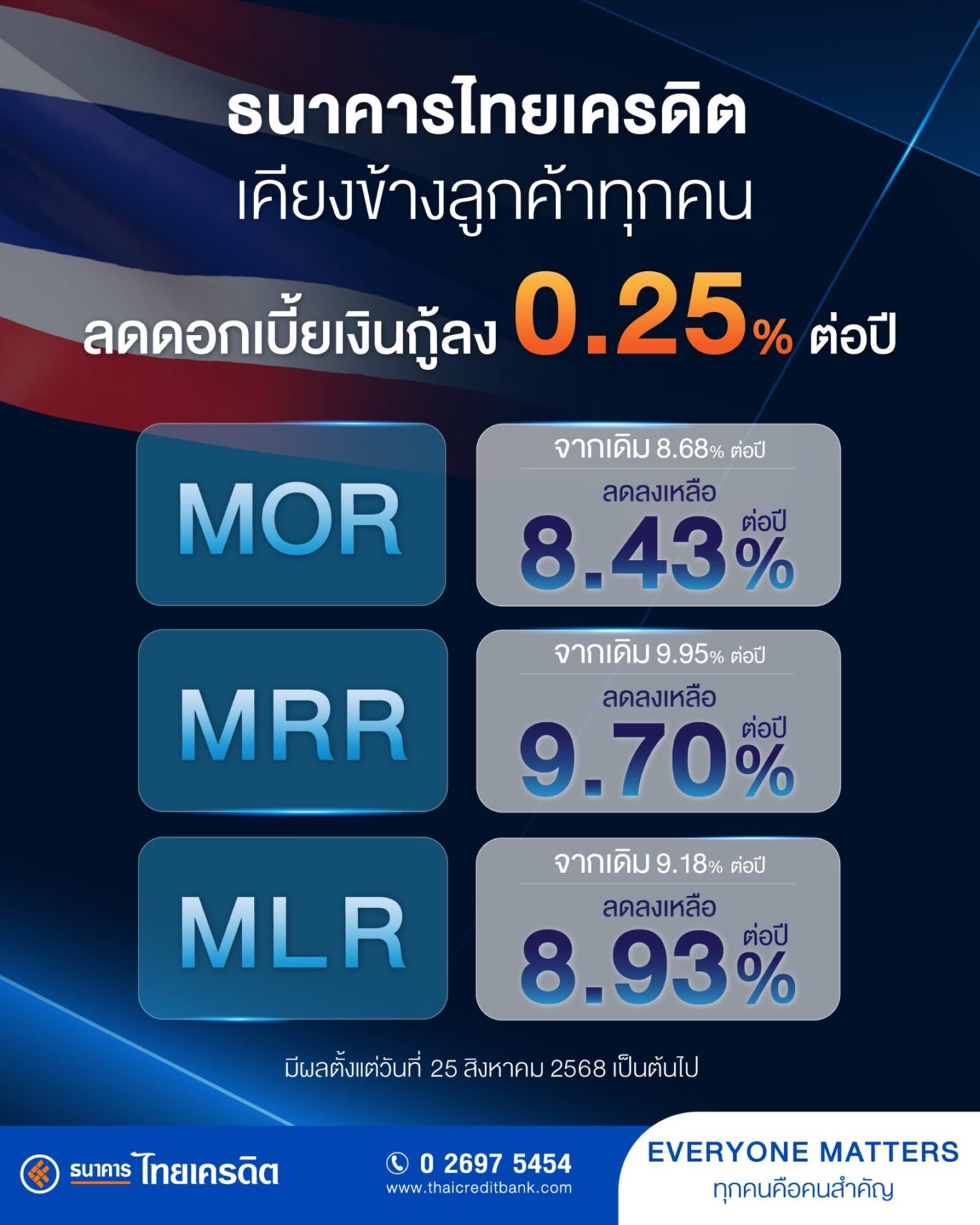 ธนาคารไทยเครดิต เคียงข้างลูกค้าทุกคน ปรับลดอัตราดอกเบี้ยเงินกู้ลง 0.25% ต่อปีธนาคารไทยเครดิต จำกัด (มหาชน) ประกาศปรับลดอัตราดอกเบี้ยเงินกู้ลง 0.25% ต่อปี มีผลตั้งแต่วันที่ 25 สิงหาคม 2568 เป็นต้นไป สอดคล้องตามมติของคณะกรรมการนโยบายการเงิน (กนง.) เพื่อเพิ่มสภาพคล่องทางการเงินของลูกค้าที่ได้รับผลกระทบในด้านภาระต้นทุนทางการเงินที่สูงขึ้นในสถานการณ์เศรษฐกิจที่มีแนวโน้มชะลอตัวในครึ่งปีหลัง