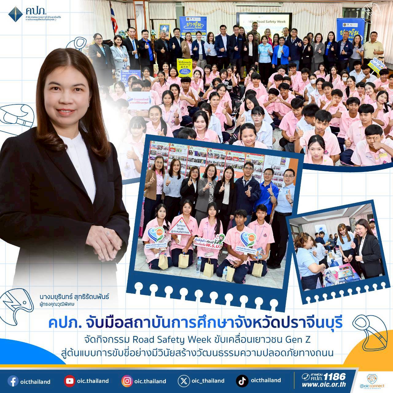 เมื่อวันที่ 22 สิงหาคม 2568 สำนักงานคณะกรรมการกำกับและส่งเสริมการประกอบธุรกิจประกันภัย (สำนักงาน คปภ.) ร่วมกับ กองทุนทดแทนผู้ประสบภัย จัดกิจกรรม Road Safety Week “ปราจีนขับขี่ปลอดภัย สไตล์ Gen Z” ภายใต้ โครงการเยาวชนปลอดภัยกับการประกันภัยภาคบังคับ (Smart Education Smart Youth) ณ โรงเรียนศรีมหาโพธิ จังหวัดปราจีนบุรี โดยมี นายอาภากร ปานเลิศ รองเลขาธิการ ด้านกำกับธุรกิจประกันภัย สำนักงาน คปภ. พร้อมด้วยคณะผู้บริหาร สำนักงาน คปภ. ผู้แทนจากสมาคมประกันชีวิตไทย สมาคมประกันวินาศภัยไทย และบริษัทประกันภัย เข้าร่วมในพิธีอย่างคับคั่ง โดยมี นางสาวจุฑามาศ บัวเผื่อน นายอำเภอศรีมหาโพธิ และ นางนรีรัตน์ ย่างเล้ง ผู้อำนวยการโรงเรียนศรีมหาโพธิ ให้การต้อนรับ