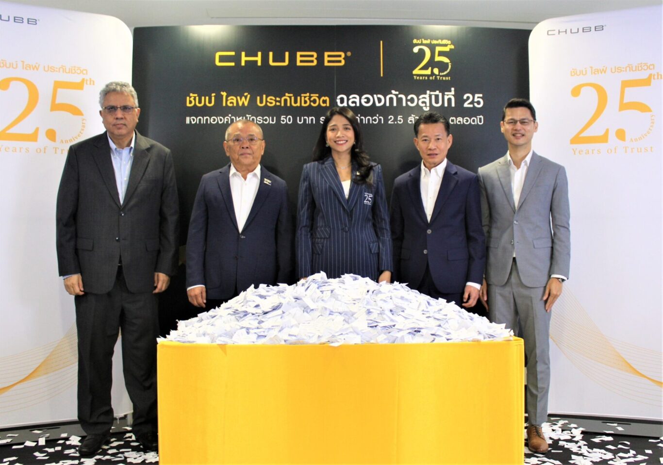 ชับบ์ ไลฟ์ ประกันชีวิต นำโดย อลิสา อารีพงษ์ ประธานเจ้าหน้าที่บริหาร พร้อมผู้บริหารระดับสูง ร่วมจับรายชื่อผู้โชคดีในแคมเปญ “ชับบ์ ไลฟ์ ประกันชีวิต 25 ปี แจกทอง 50 บาท” ครั้งที่ 1 ให้กับลูกค้าที่ทำประกันชีวิตตามเงื่อนไข จำนวน 100 รางวัล น้ำหนักรวม 25 บาท โดยบริษัทฯ จะประกาศรายชื่อผู้ได้รับรางวัลอย่างเป็นทางการผ่านทางเว็บไซต์ของบริษัทฯ https://www.chubb.com/th-th/celebrating-25th-anniversary.html ทางสื่อโซเชียลมีเดียของ ชับบ์ ไลฟ์ ประกันชีวิต และทาง SMS