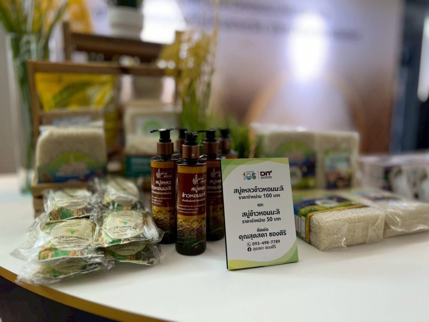 ทั้งนี้ ภายในงานมีการจัดแสดงนิทรรศการและผลิตภัณฑ์ของผู้ชนะการประกวดข้าวหอมมะลิฯ การทำ MOU เชื่อมโยงการซื้อขายระหว่างผู้ประกอบการค้าข้าวกับผู้ชนะการประกวด มีผลิตภัณฑ์ข้าวของผู้ชนะการประกวดฯ หลากหลายแบรนด์ ที่นำมาให้ชิมและจำหน่ายในราคาพิเศษ อาทิ ข้าวหอมมะลิอินทรีย์ (ข้าวภูลังกา) และข้าวตราเรือไฟ จาก จ.นครพนม ข้าวตราช้างชุมพล จ.สุรินทร์ ข้าวนาคุณตาณรงค์ จ.อุบลราชธานี ข้าวจากกลุ่มข้าวปลอดสารพิษ ต.แม่อ้อ จ.เชียงราย และผลิตภัณฑ์ที่ต่อยอดจากข้าวหอมมะลิ เช่น ผลิตภัณฑ์ข้าวจากธัญพืช “พองพองไรซ์” ผลิตภัณฑ์นวัตกรรม “ข้าวแท่ง (Rice Bar)” ไอศกรีมข้าวหอมมะลิจากเกษตรกร จ.ฉะเชิงเทรา และเครื่องดื่ม MR.SATO ที่รังสรรค์จากข้าวไทย และความใส่ใจแบบคราฟต์