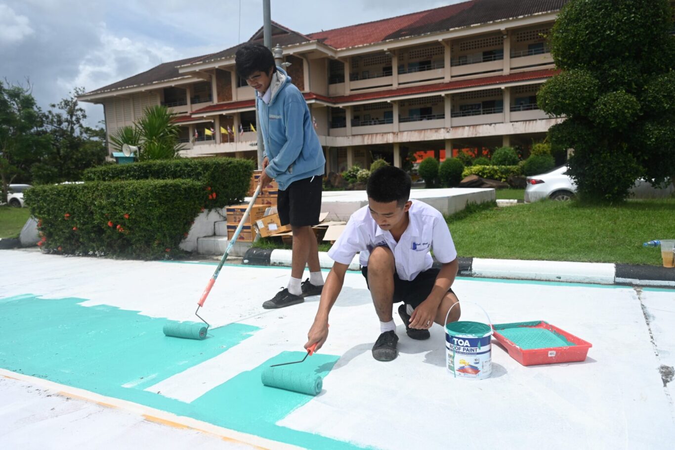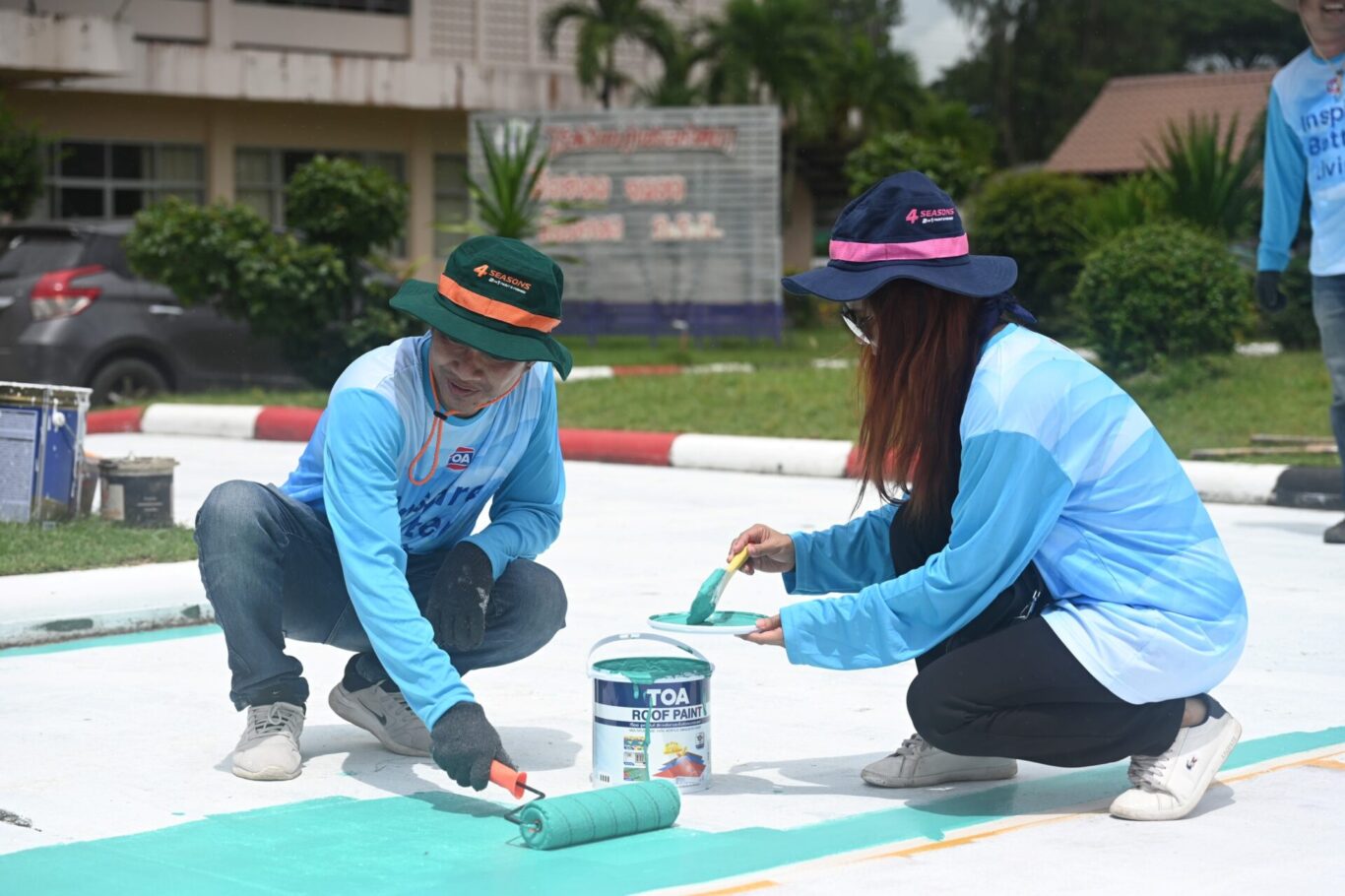 นอกจากนี้ ยังได้ลงพื้นที่อาสาทาสีฟื้นฟู โรงเรียนภูมิซรอลวิทยา ที่อยู่ในพื้นที่ใกล้เคียงกันด้วย เนื่องจากได้รับความเสียหายจากแรงสั่นสะเทือนและสะเก็ดระเบิด ทำให้หลายอาคารเรียนและสนามกิจกรรมทรุดโทรม โดยพนักงานจิตอาสาและนักเรียนมาร่วมทาสีฟื้นฟูพื้นสนามโรงเรียนด้วยผลิตภัณฑ์ TOA Roof Paint สีคุณภาพสูง สำหรับทาสนามพื้นคอนกรีต ช่วยการยึดเกาะอย่างดีเยี่ยม พร้อมมอบผลิตภัณฑ์สี 4Seasons สำหรับปรับปรุงอาคารเรียนต่างๆ ให้กลับมามีสีสันที่สดใส สวยงาม เตรียมต้อนรับการเปิดภาคเรียนใหม่ให้กับน้องๆ นักเรียนทุกคน