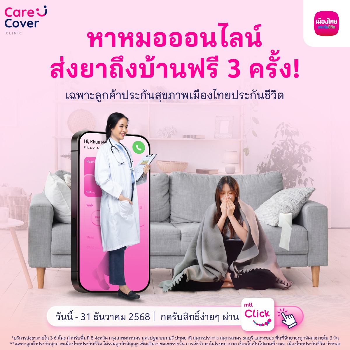 เมืองไทยประกันชีวิต จับมือ “CareCover Clinic” มอบบริการพิเศษ พบแพทย์ออนไลน์ พร้อมรอรับยาที่บ้าน ฟรี! สำหรับลูกค้าที่ถือกรมธรรม์ประกันสุขภาพรายบุคคล