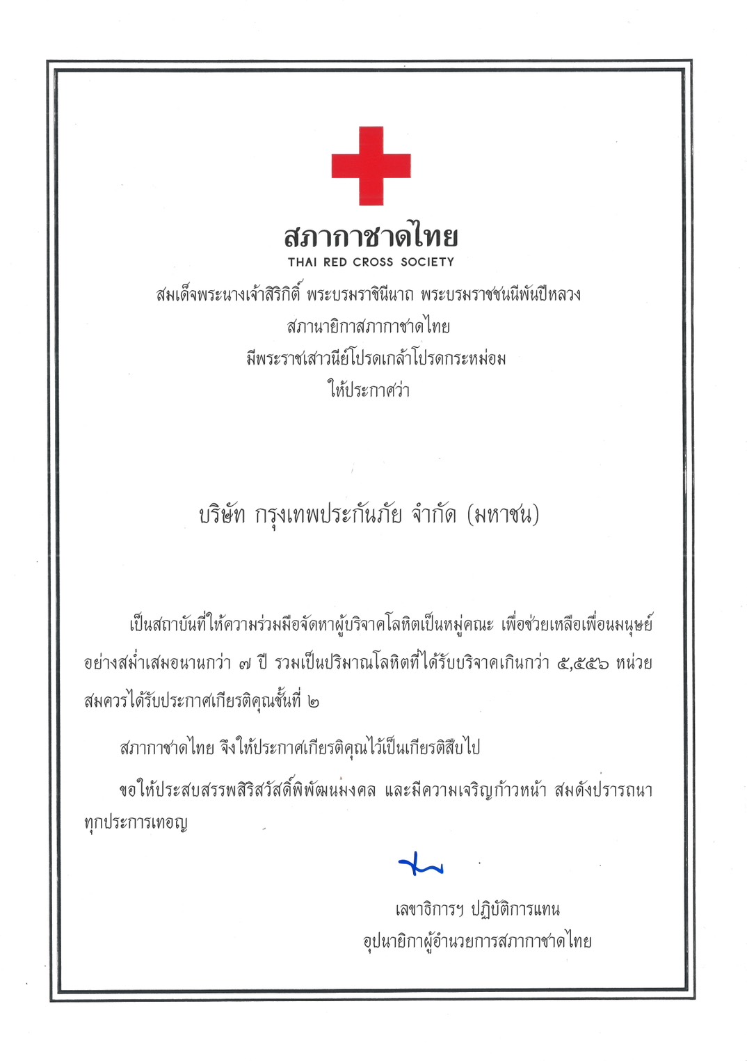 บริษัท กรุงเทพประกันภัย จำกัด (มหาชน) ได้รับใบประกาศเกียรติคุณชั้นที่ 2 จากสภากาชาดไทย ในฐานะองค์กรที่ให้การสนับสนุนและความร่วมมือในการจัดหาผู้บริจาคโลหิตเป็นหมู่คณะอย่างต่อเนื่อง โดยบริษัทฯ ได้ดำเนินโครงการบริจาคโลหิตมาตั้งแต่ปี 2531 และจัดกิจกรรมทุก 3 เดือน เพื่อสนับสนุนการสำรองโลหิตให้เพียงพอสำหรับการรักษาผู้ป่วยในโรงพยาบาลต่างๆ ทั่วประเทศ ถือเป็นการต่อชีวิตและยกระดับคุณภาพชีวิตที่ดีของคนในสังคม ควบคู่ไปกับการขับเคลื่อนนโยบายพัฒนาองค์กรอย่างยั่งยืน ตลอดระยะเวลากว่า 3 ทศวรรษที่ผ่านมา บริษัทฯ มุ่งมั่นสร้างสังคมแห่งการแบ่งปัน ด้วยการเชิญชวนผู้บริหาร พนักงาน ลูกค้า คู่ค้า ตลอดจนประชาชนทั่วไป เข้าร่วมกิจกรรมบริจาคโลหิต รวมถึงการบริจาคอวัยวะและดวงตา เพื่อสนับสนุนภารกิจของสภากาชาดไทย อันเป็นการสืบสานเจตนารมณ์แห่งการให้และการช่วยเหลือเพื่อนมนุษย์อย่างแท้จริง